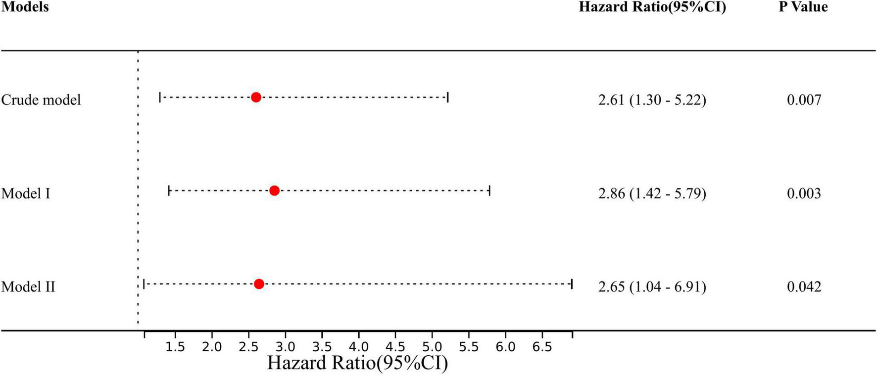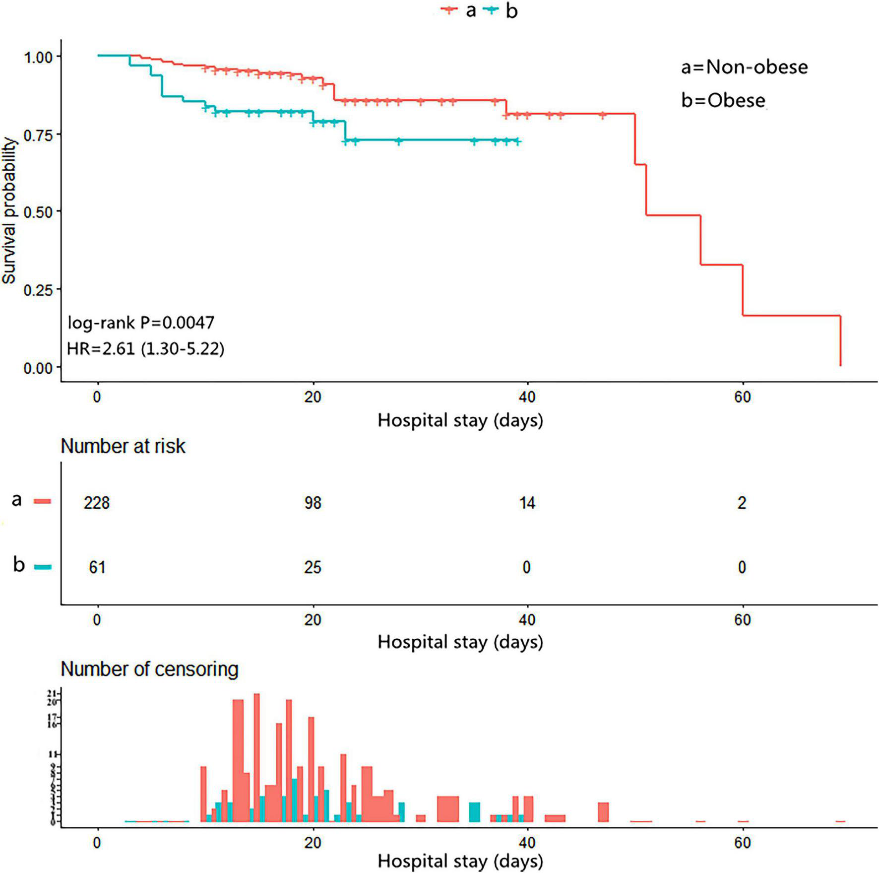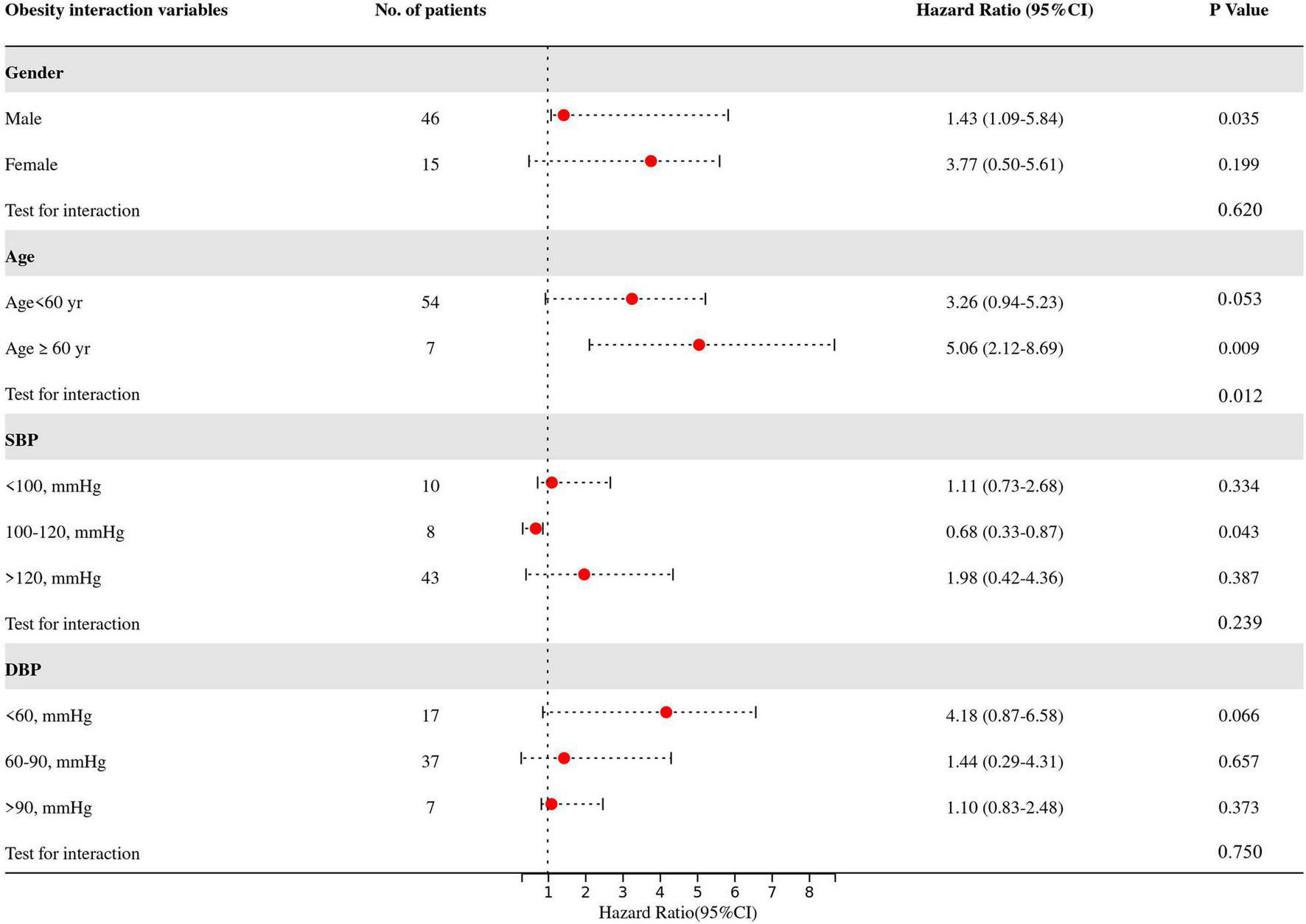 All the 289 patients had a mean age of 48.64 (IQR 44.00–55.00) and 74.39% were men. Of the 289 patients, 228 were non-obese (78.89%) and 61 were obese (21.11%). Patients with obesity were younger and more prone to unstable blood pressure [systolic blood pressure (SBP) and diastolic blood pressure (DBP)], preoperative hypoxemia and delirium, prolonged operative time, and surgical wound deep infection (p < 0.05). In the fully adjusted model, we observed an increased risk of in-hospital mortality in patients with obesity after fine-tuning other covariates including age and sex (HR = 2.65; 95% CI = 1.03 to 6.80; p = 0.042). The interaction suggested that obesity was more likely to cause death in elderly patients (age ≥ 60), although it was more common in younger patients (test for interaction, p = 0.012).