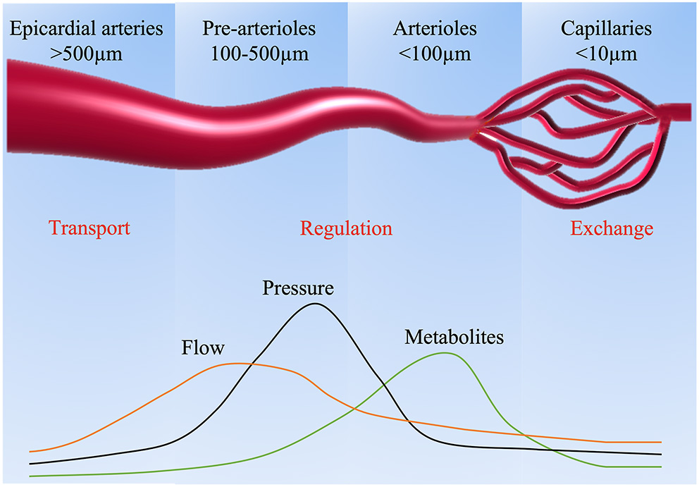 Myocardial perfusion is mainly governed by dynamic and combined changes in the epicardial coronary vasculature and microcirculation. Under resting conditions, the myocardium extracts roughly 75% of the blood oxygen with minimal reserve for additional oxygen extraction (13). Thus, the regulation of myocardial blood flow (MBF) becomes especially critical to keep balance between oxygen consumption and demand, which mainly resides in the microcirculation of coronary vasculature. Based on the size of the arterial structure, the capacitance and the resistance to MBF, the coronary arterial vasculature is divided into three compartments (Figure 1). The large epicardial coronary arteries (5 mm to 500 μm in diameter) have a capacitance function and normally offer negligible coronary resistance to blood flow. Epicardial coronary arteries can increase their blood content by around 25% and accumulate elastic energy by dilating during systole. The elastic energy is then converted into blood kinetic energy at the beginning of diastole. The pre-arterioles vessels (100–500 μm in diameter) represent the middle compartment, with a measurable drop in pressure. Their main function is to maintain pressure within a narrow range at the origin of the arterioles in response to changes in coronary perfusion pressure or flow. Finally, the distal compartment is made of arterioles (diameter <100 μm), which have the largest pressure drop compared to other compartments, characterized by matching blood supply to myocardial oxygen consumption with the tone influenced by metabolites produced during myocardial metabolism.