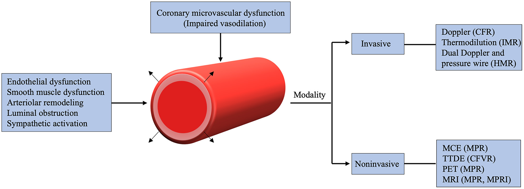 Mechanisms and various imaging modalities of coronary microvascular dysfunction. CFR, coronary flow reserve; CFVR, coronary flow velocity reserve; HMR, hyperemic microvascular resistance; IMR, index of microcirculatory resistance; MCE, myocardial contrast echocardiography; MPR, myocardial perfusion reserve; MPRI, myocardial perfusion reserve index; TTDE, Transthoracic Doppler echocardiography; MRI, magnetic resonance imaging; PET, positron emission tomography.