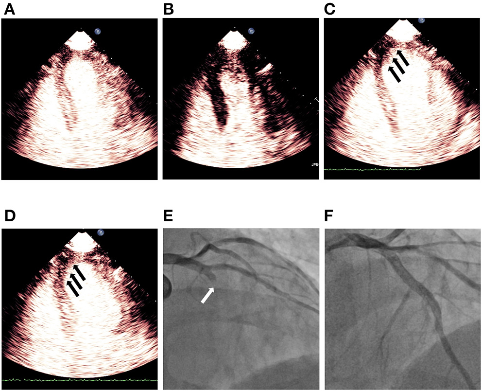 Demonstration of persistent no reflow phenomenon noticed on MCE after successful revascularization of LAD STEMI. (A) Shows myocardial contrast replenishment before the high MI impulse, while (B) indicates complete microbubble destruction immediately after the high MI impulse. (C) Shows a defect (black arrows) in the segments of the infarct zone during replenishment (~4 beats post-high MI impulse), while (D) indicates a persistent defect (black arrows) in LAD territory although a plateau intensity (~10 beats after the high MI impulse) had been reached. (E) Shows blocked LAD (white arrow) before PCI and (F) indicates revascularization of LAD after successful PCI. LAD, left anterior descending; MCE, myocardial contrast echocardiography; PCI, percutaneous coronary intervention; STEMI, ST segment elevated myocardial infarction.