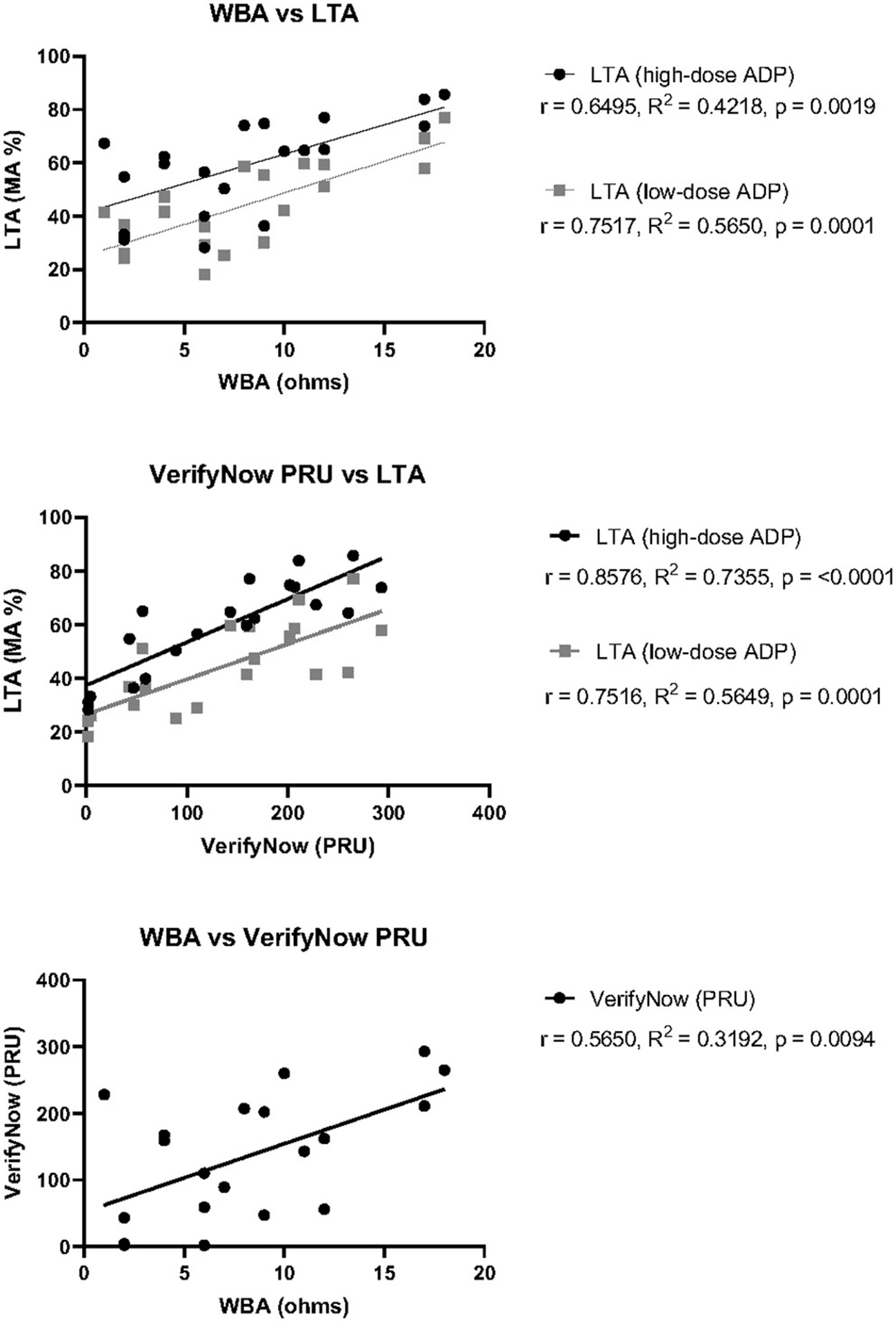 Correlation of P2Y12-I response test measurements between three test platforms. Pearson's correlation coefficient (r), goodness of fit by simple linear regression (R2), and statistical significance (p) was calculated for each pair of tests using the raw measurement values obtained for each patient. Top: WBA against either LTA with high-dose ADP (black) or low- dose ADP (gray). Middle: VerifyNow PRU Test against either LTA with high-dose ADP (black) or low-dose ADP (gray). Bottom: WBA against VerifyNow PRU Test.