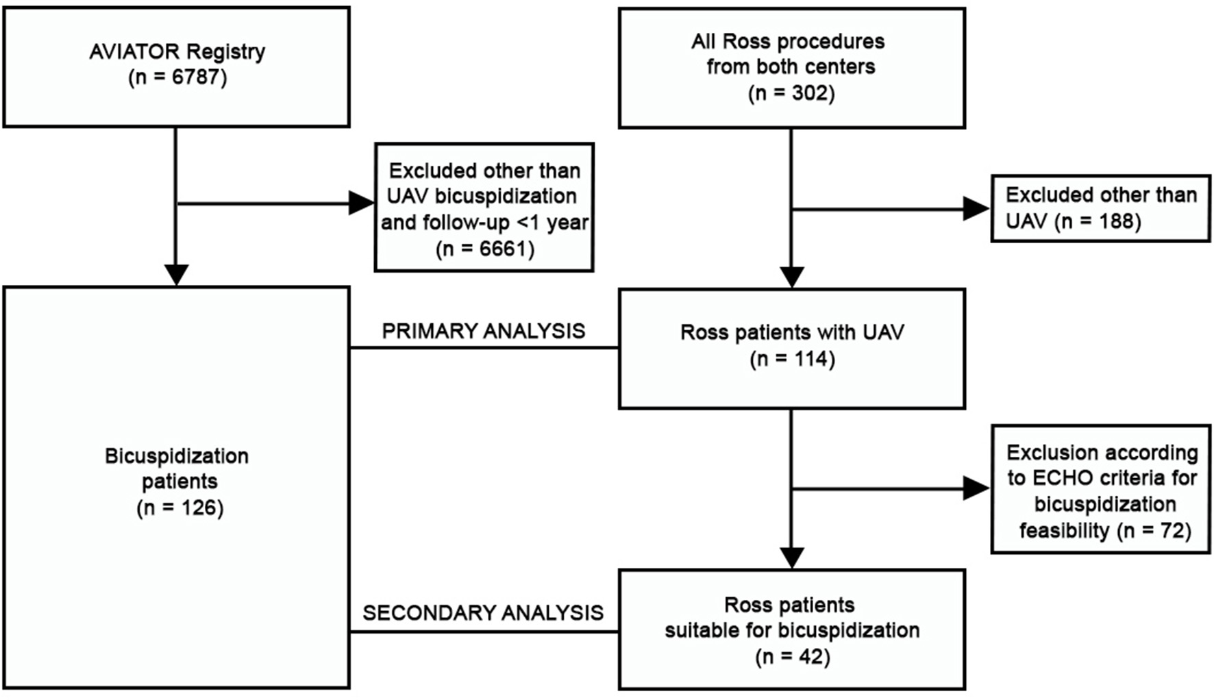 This was a multi-center retrospective observational cohort study and the flowchart is illustrated in detail in Figure 1. Data on Ross procedure were provided by the two collaborating institutions from the Czech Republic (stated above). The data were manually extracted from patient hospital records and the annual postoperative clinical and echocardiographic follow-up controls. All patients with UAV undergoing Ross procedure at our institutions were included. Although the AVIATOR registry comprises also multi-center data on Ross procedures, we decided not to utilize them for the following reasons: (i) a limited number of surgeries; (ii) restricted follow-up and limited data on reinterventions; (iii) we did not have access to preoperative echocardiograms in order to perform a thorough analysis.