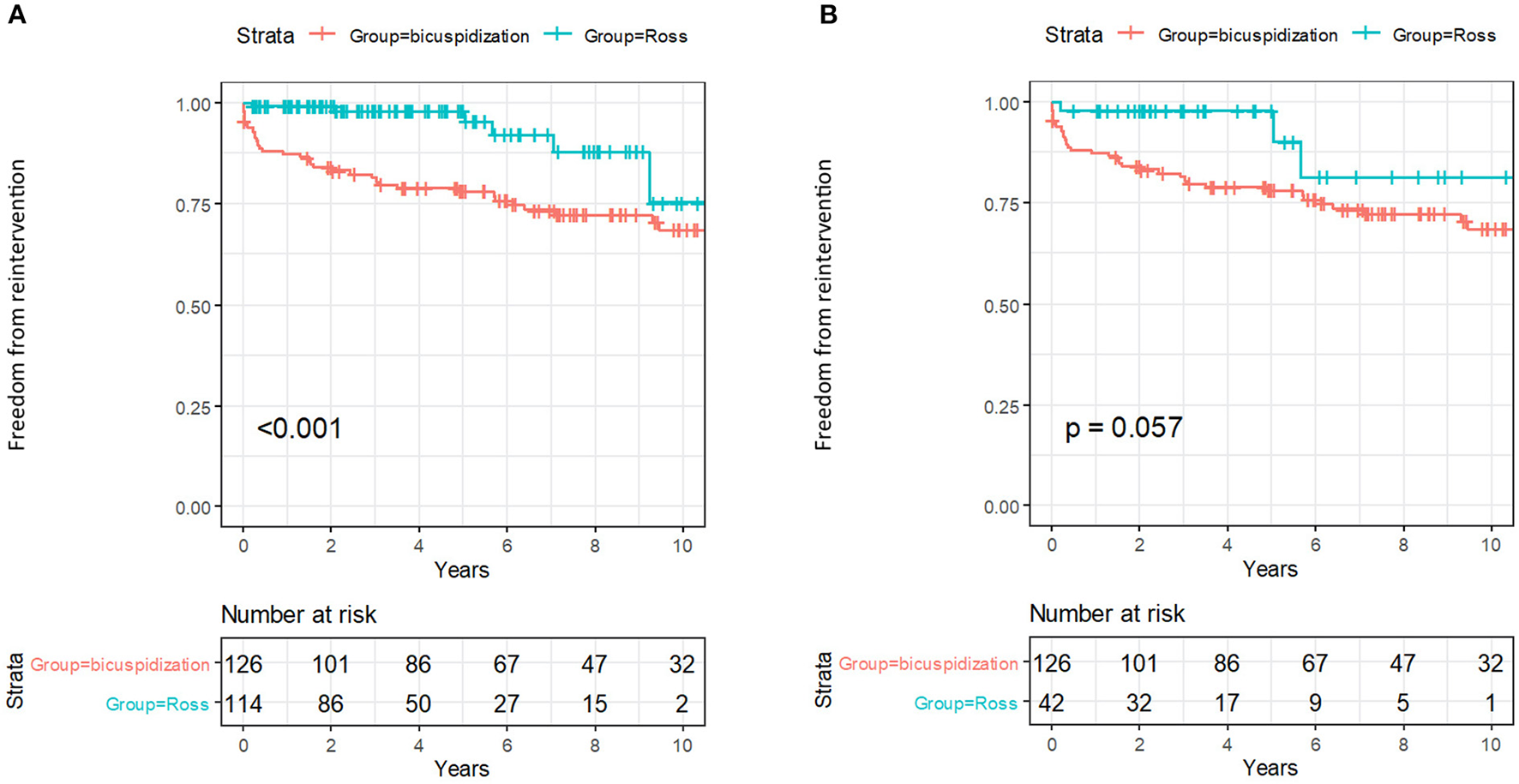 Primary endpoint was the freedom from reintervention in the mid-term postoperative follow-up. Both autograft and homograft reinterventions were included in the analysis of the Ross group as long as both were associated with the initial procedure. In the bicuspidization group, only aortic valve reinterventions were included in the analysis. Secondary endpoints were mid-term freedom from major adverse cardiovascular and cerebral events (MACCE; including death, stroke and hemorrhage), freedom from endocarditis and pacemaker implantation. We performed the comparison of standard short-term perioperative measures and complications, as well.