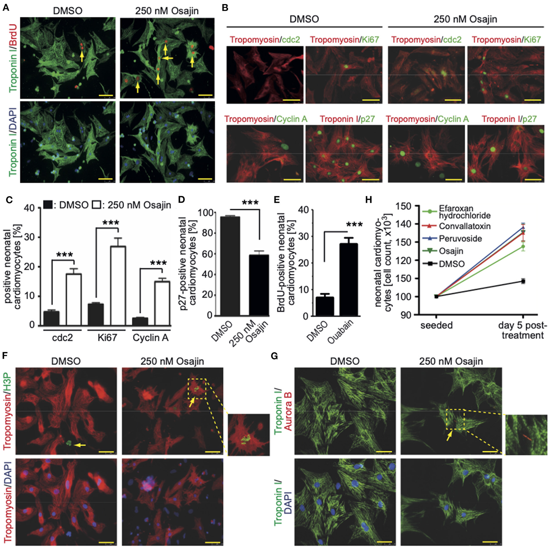 Promoting neonatal cardiomyocyte cell cycle progression by small molecules (Positive hits). (A) Osajin induced BrdU incorporation of P3 neonatal cardiomyocytes (n = 6). Representative example of neonatal cardiomyocytes stained for BrdU (red) and troponin I (green, cardiomyocyte-specific). Examples are indicated by arrows. DNA was visualized using DAPI (blue). (B) Osajin treatment induced increased expression of cell cycle promoting factors and decreased expression of cell cycle inhibitors (immunofluorescence analyses at 48 h after stimulation). Representative example of neonatal cardiomyocytes stained for cdc2, Ki67, cyclin A, or p27 (green) and tropomyosin (red, cardiomyocyte-specific). DNA was visualized using DAPI (blue). (C,D) Quantitative analysis of (B) (n = 6, mean ± SEM, ***: p < 0.001). (E) Quantitative analysis of the number of BrdU-positive cardiomyocytes after ouabain treatment (n = 6, mean ± SEM, ***: p < 0.001). (F,G) Representative examples of osajin-stimulated neonatal cardiomyocytes stained for tropomyosin (red) or troponin I (green, both cardiomyocyte-specific) undergoing mitosis (H3P, green) and cytokinesis (Aurora B, red). Examples are indicated by arrows. Arrowhead: H3P-positive non-myocyte. DNA was visualized using DAPI (blue). (H) Quantitative analysis of the increase in cell number five days after treatment with the indicated compounds (n = 5, mean ± SD). Scale bars: 50 μm.