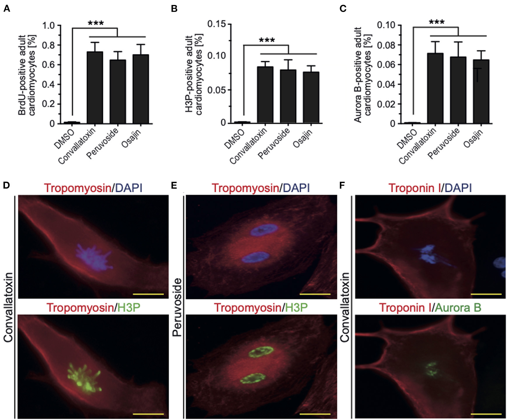 Osajin and cardiac glycosides promote adult cardiomyocyte cell cycle progression. (A–C) Quantitative analysis of cell cycle progression [BrdU incorporation, (A)], mitosis [H3P, (B)], and cytokinesis [Aurora B, (C)] (n = 6, mean ± SEM, ***: p < 0.001). (D–F) Representative examples of adult rat cardiomyocytes (tropomyosin- or troponin I-positive) utilized for the quantitative analysis in (B,C). (D) Mononucleated adult rat cardiomyocyte stained for H3P in pro-metaphase. (E) Binucleated adult rat cardiomyocyte stained for H3P in G2 to prophase. (F) Binucleated adult rat cardiomyocyte stained for aurora B in G2 to prophase.