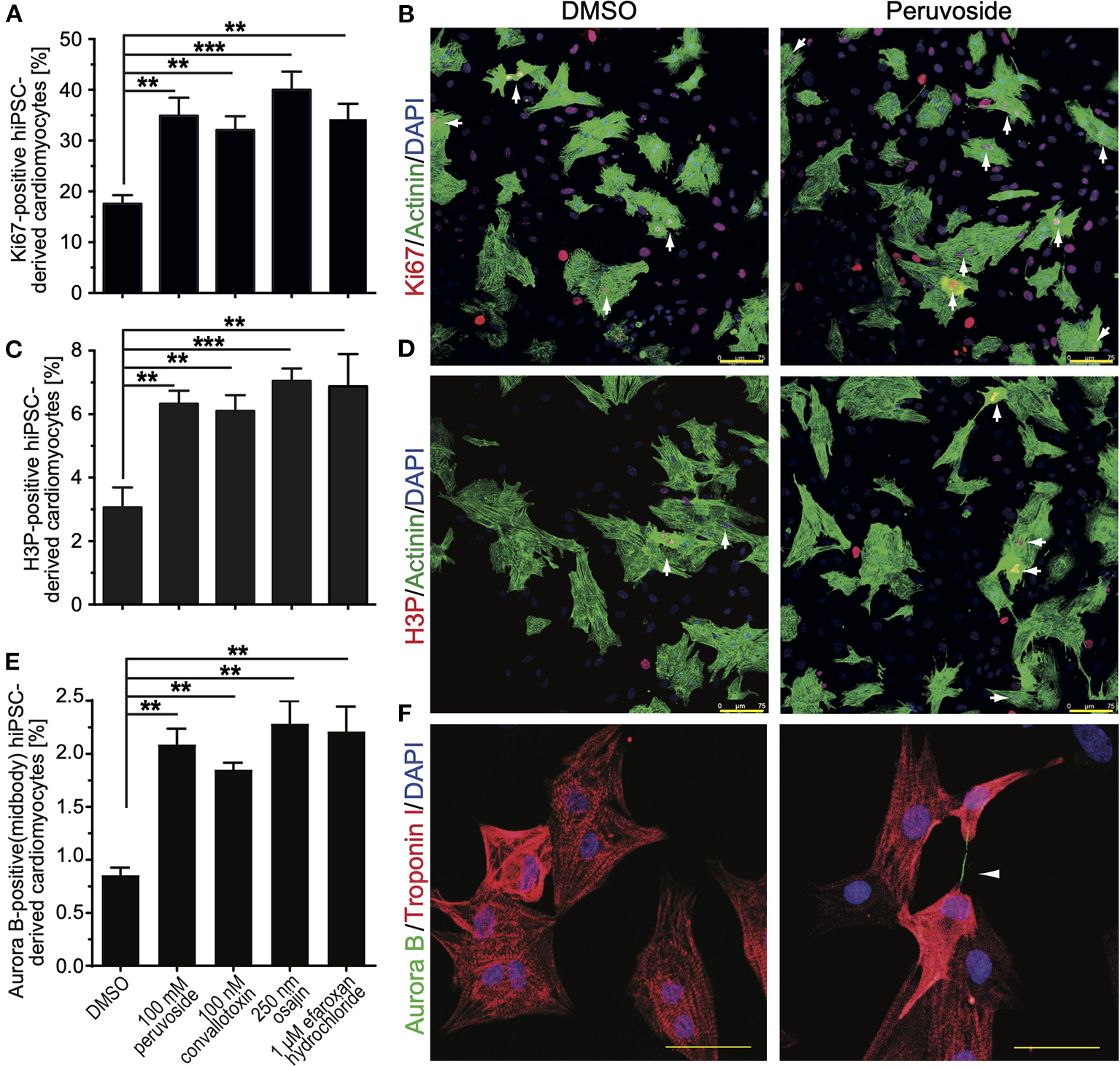 Aiming at evaluating the translation potential of the identified compounds, the effect of the positive hits, including cardiac glycosides, on cell cycle progression in hiPSC-derived cardiomyocytes was assessed. HiPSC-derived cardiomyocytes were treated with DMSO or peruvoside (100 nM), convallotoxin (100 nM), osajin (250 nM), and efaroxan hydrochloride (1 μM) and analyzed for changes in the expression of Ki67 or phosphorylation of histone H3 (H3P) 48 h post-treatment (Figures 6A–D). Pervuvoside significantly increased the number of both Ki67- and H3P-positive cardiomyocytes compared to DMSO (Ki67: 34.90 ± 2% vs. DMSO: 17.57 ± 0.97%, p < 0.01; H3P: 6.3 ± 0.23% vs. DMSO: 3.06 ± 0.36%, p < 0.01). Similarly, all other tested compounds exhibited a positive effect on cell cycle progression in hiPSC-derived cardiomyocytes (convallotoxin: Ki67: 32.07 ± 1.57%, H3P: 6.1 ± 0.28%; osajin: Ki67: 40.00 ± 2.0%, H3P: 7.04 ± 0.22%; efaroxan hydrochloride: Ki67: 34.25 ± 1.7%, H3P: 6.88 ± 0.58%; all p < 0.01, Figures 6A–D). Finally, we analyzed Aurora B-positive cardiomyocytes at midbody indicative for cell division. We found that pervuvoside significantly increased cardiomyocytes in cytokinesis compared to DMSO (Aurora B at midbody: 2.08 ± 0.08% vs. DMSO: 0.85 ± 0.04%, p < 0.01) (Figures 6E,F). Similarly, all other tested compounds exhibited a positive effect on cardiomyocyte cytokinesis (convallotoxin: 1.85 ±0.04%; osajin: 2.28 ± 0.12%; efaroxan hydrochloride: 2.21 ± 0.13%; all p < 0.01, Figure 6E). Taken together, these data suggest that cardiac glycosides, as well as osajin and efaroxan hydrochloride, also positively affect cell cycle progression in hiPSC-derived cardiomyocytes.