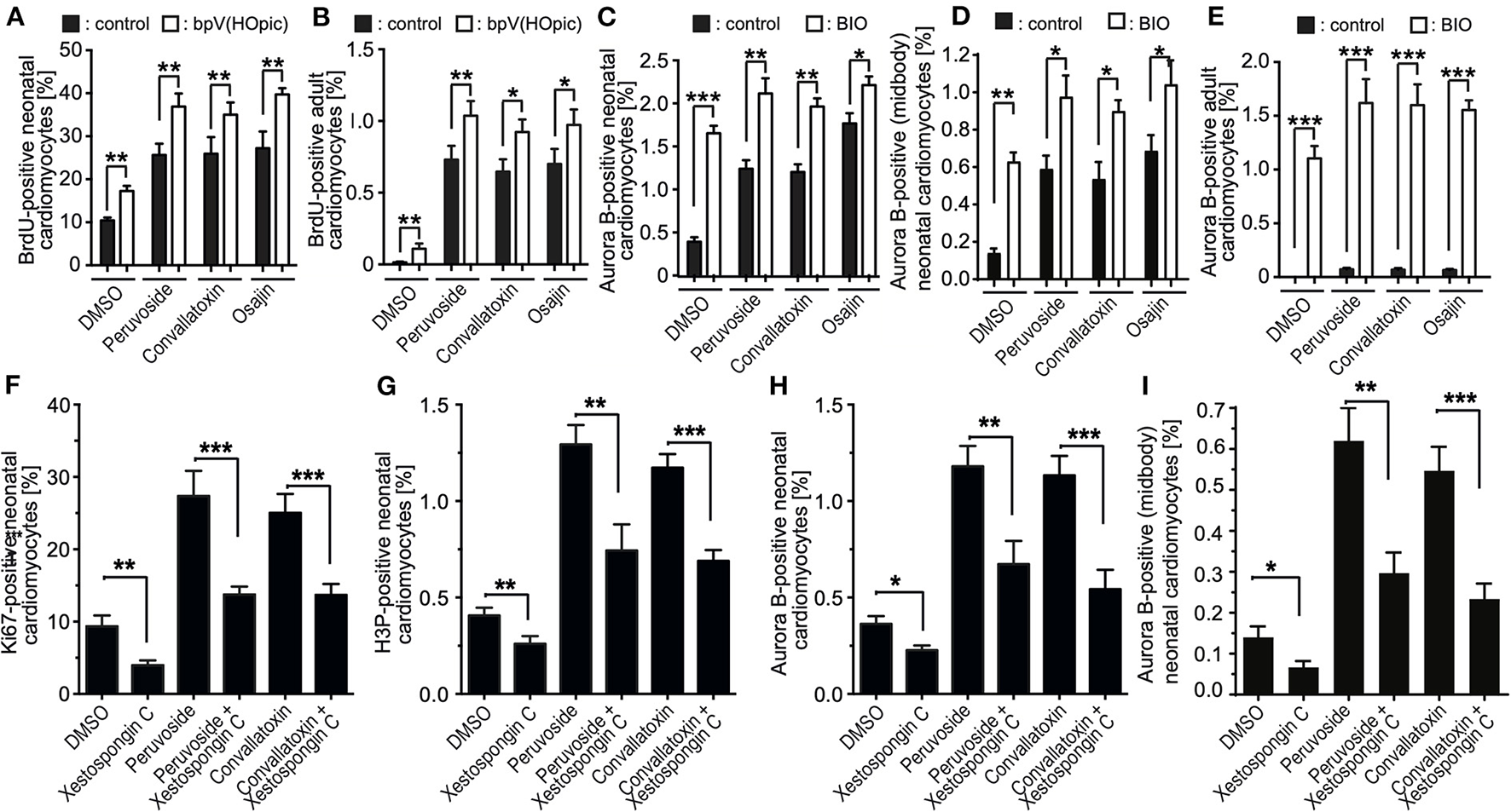Mechanistic analysis of compound-enhanced cell cycle progression. (A–E) Inhibition of PTEN, as well as GSK-3β enhances cell cycle progression induced by cardiac glycosides and osajin. Quantitative analysis of BrdU- (A,B) and Aurora B- (C,E), Aurora B at the midbody in neonatal cardiomyocytes (D), positive neonatal (A,C) and adult (B,E) cardiomyocytes upon stimulation with cardiac glycosides and osajin in the presence and absence of PTEN inhibitor bpV (HOpic) (A,B) or GSK3-β inhibitor BIO (C–E). n = 6, mean ± SEM, *: p < 0.1, **: p < 0.01, ***: p < 0.001. (F–I) Inhibition of IP3 receptor impedes peruvoside- and convallotoxin-induced cardiomyocyte cell cycle progression. Neonatal rat cardiomyocytes were stimulated with glycosides in the absence or presence of IP3 receptor inhibitor xestospongin C (1 μM) and the number of Ki67-, H3P-, and aurora B-positive cardiomyocytes were evaluated. Quantitative analysis of the percentage of Ki67- [cell cycle progression, (F)], H3P- [mitosis, (G)], and aurora B- [cytokinesis, (H,I)] positive cardiomyocytes (n = 6, mean ± SEM, *: p < 0.05), **: p < 0.01, ***: p < 0.001.