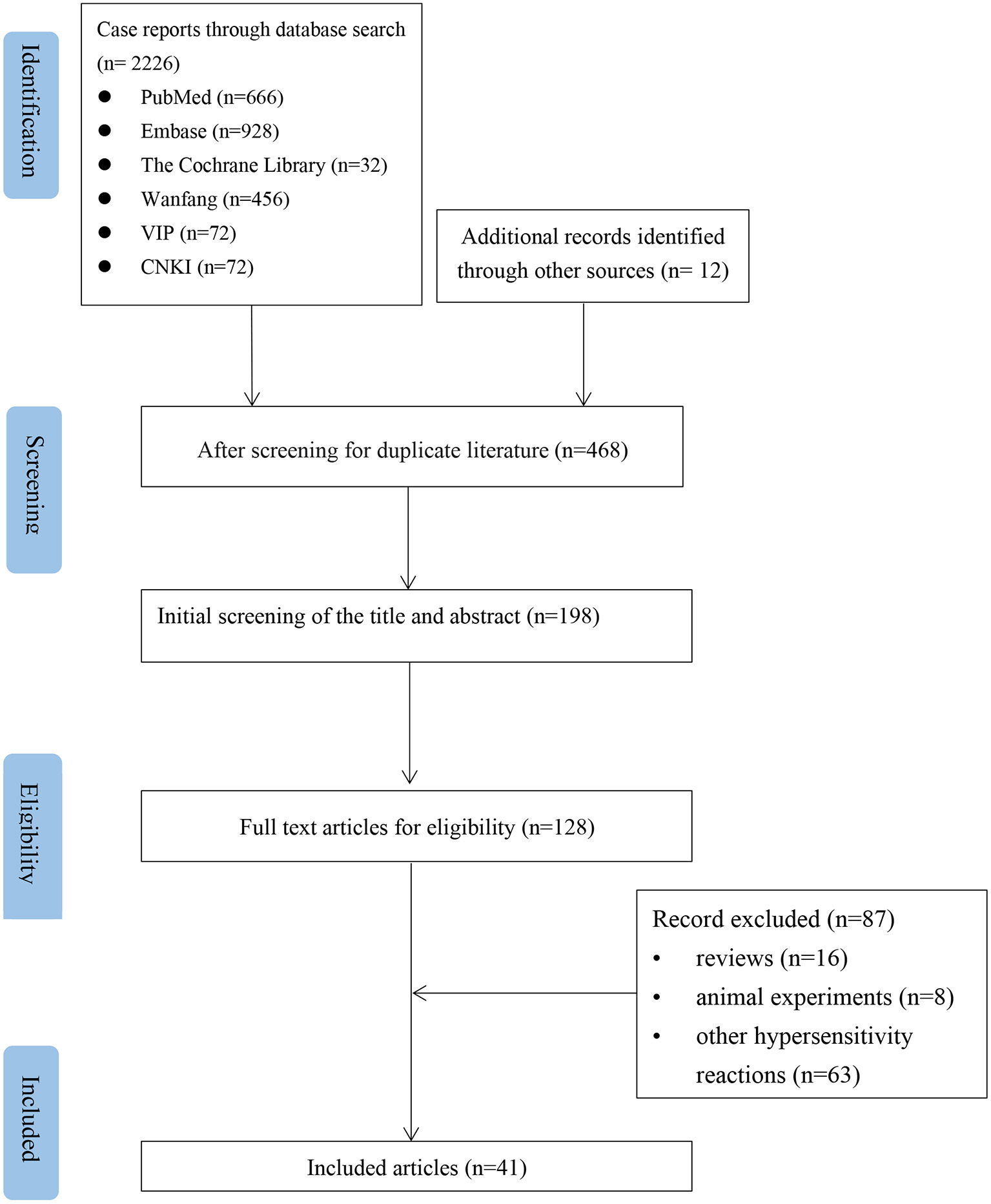 According to the inclusion and exclusion criteria, after independent screening by two authors, 41 articles were included, all of which were case reports. The literature screening is shown in Figure 1. The bias assessment of the case reports was evaluated using the National Institute for Clinical Excellence (NICE) quality scale. The quality of the included reports was low, with an overall score of 3–5.