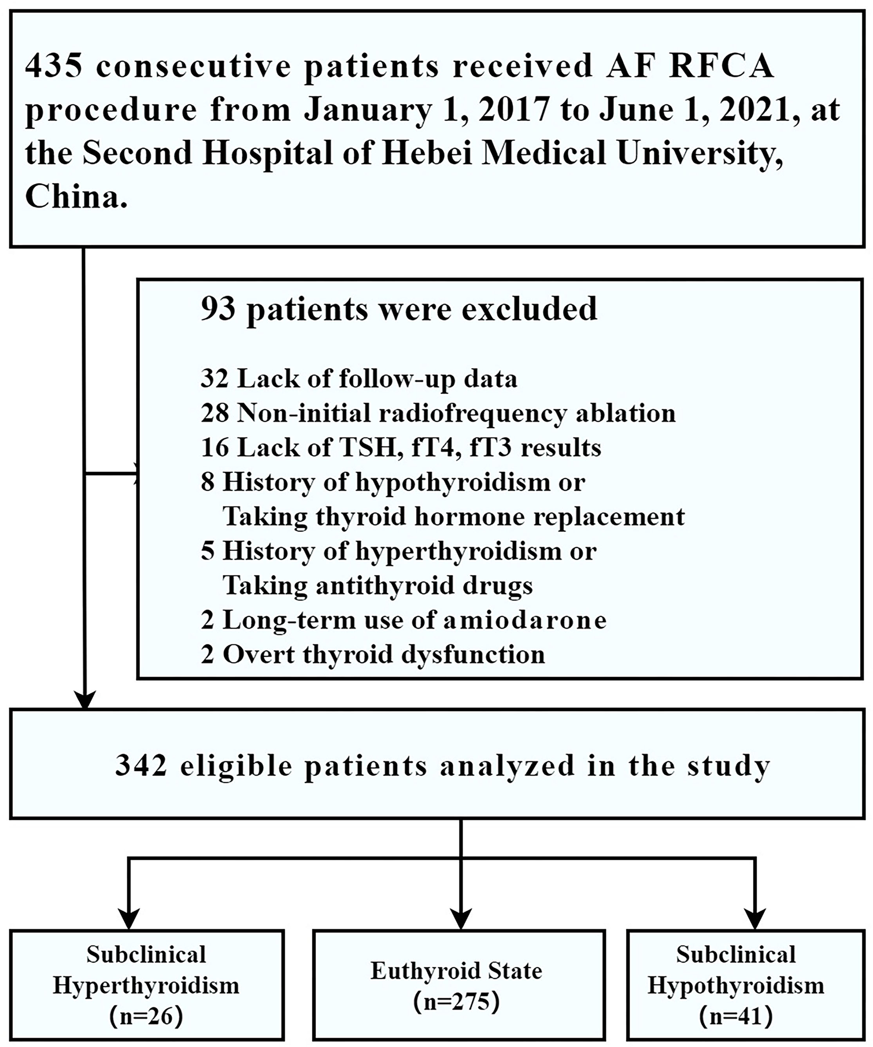 From 1 January 2017 to 1 June 2021, 435 consecutive patients who underwent RFCA for drug-refractory symptomatic AF were enrolled in our disease-specific database. Among them, 32 patients were excluded owing to lack of follow-up data; 28 patients were excluded because of non-initial radiofrequency ablation; 16 were excluded for lack of TSH, fT4, and fT3 results; 15 patients were excluded because of a history of hypothyroidism (n = 8) or a history of hyperthyroidism (n = 5), current overt thyroid dysfunction (n = 2); 2 patients were excluded for the long-term use of amiodarone, thus leaving 342 patients for the analysis (subclinical hyperthyroidism, n = 26; euthyroid state, n = 275; subclinical hypothyroidism, n = 41) (Figure 1).