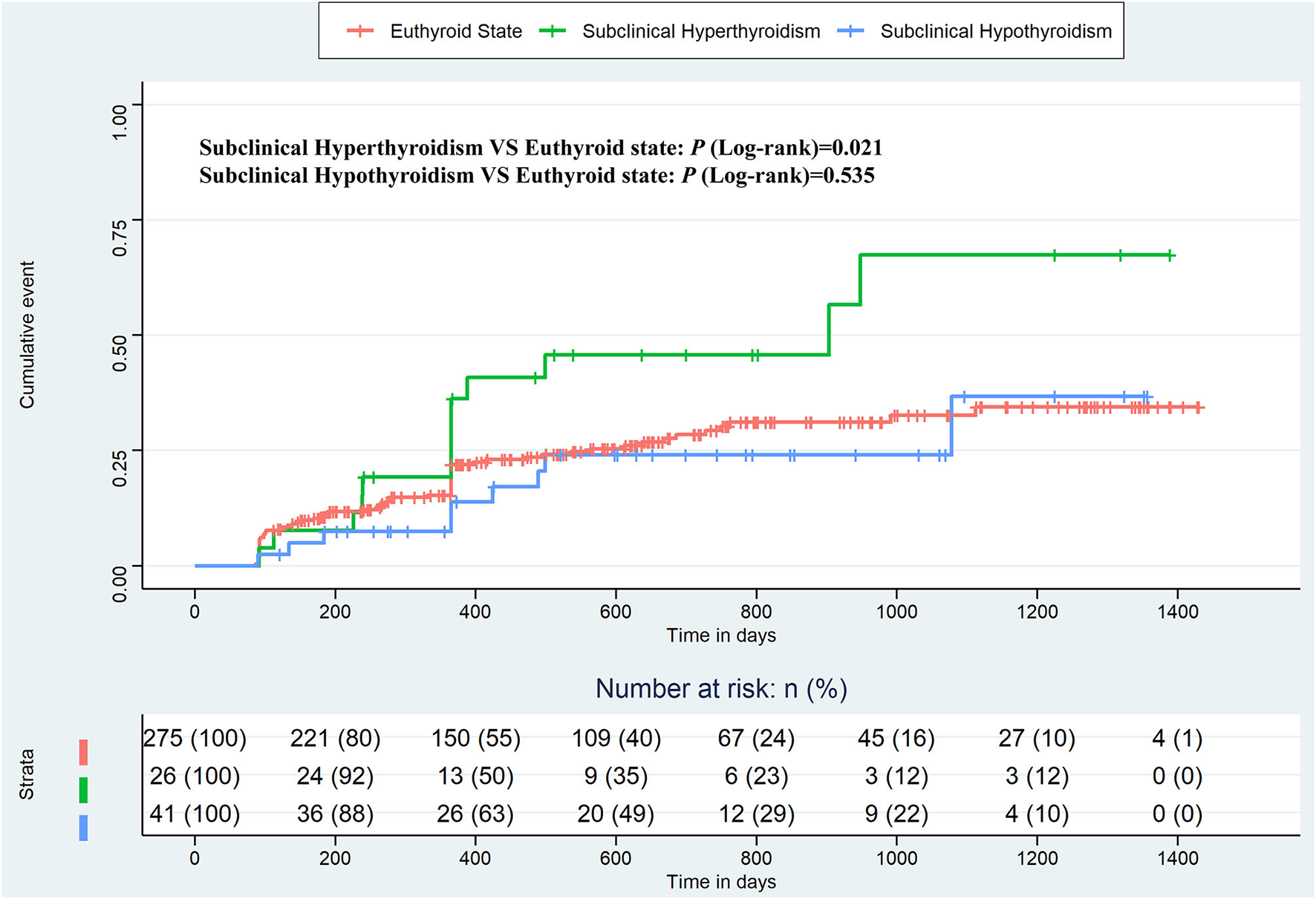 Over a median of 489 days (maximum 1,430 days) of follow-up of the 342 patients in the cohort, the end point event of recurrence of AF developed in 91 patients (26.6%) (subclinical hyperthyroidism, 13/26, 50.0%; euthyroid state, 69/275, 25.1%; subclinical hypothyroidism, 9/41, 22.0%).