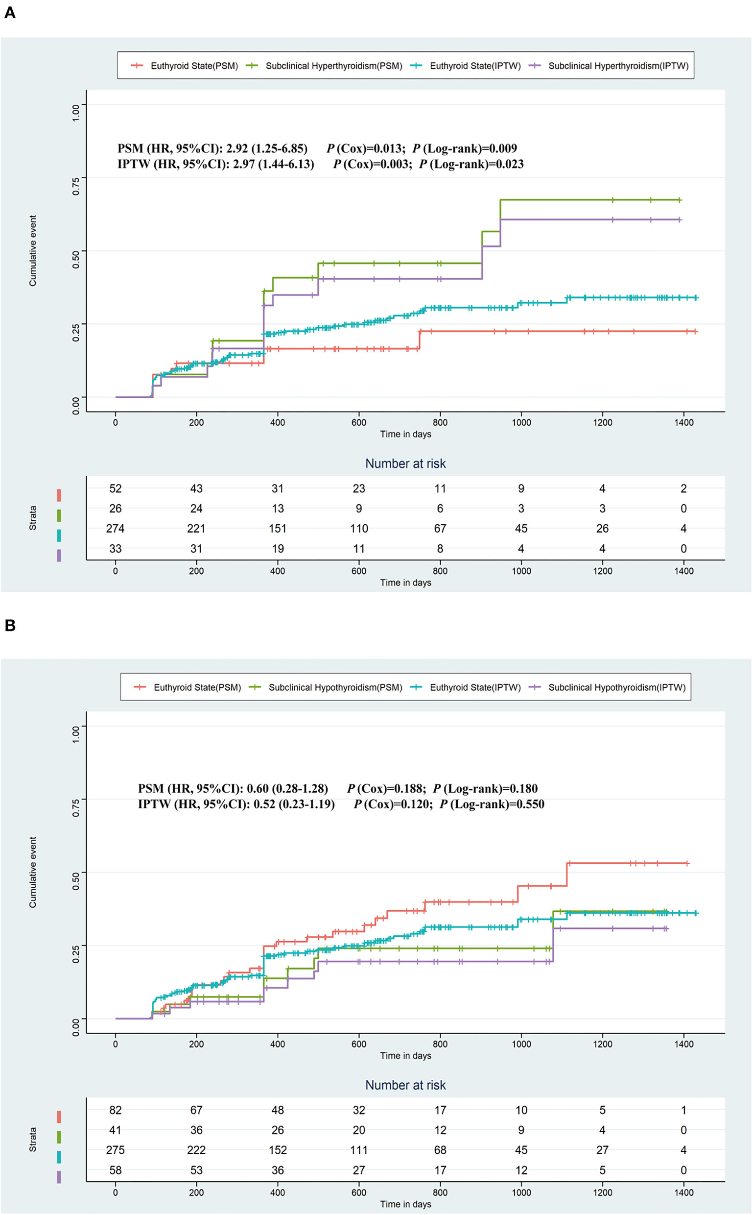The odds ratios (with 95% CI) of all the variables included in the logistic PS models are shown in Supplementary Table 1. The C-statistics for the PS models were 0.792 and 0.790, respectively (Supplementary Figure 1). Compared to the euthyroid state, the distribution of the PS for subclinical hyperthyroidism and subclinical hypothyroidism before and after PSM is shown in Supplementary Figure 2.