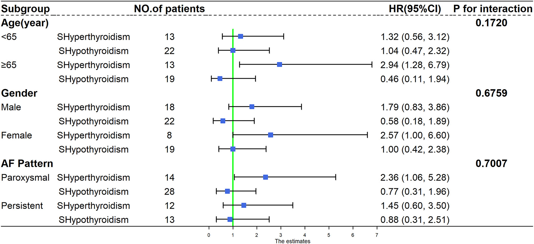 Stratified analyses were performed to estimate the associations of subclinical thyroid dysfunction and the end point event according to gender (male and female) and age (<65 and ≥65 years) because TSH distribution differed significantly by age and sex (18). The cutoff for age was determined to avoid inappropriately small participant numbers within individual subgroups. And we further conducted subgroup analyses on different AF patterns (paroxysmal AF and persistent AF). The likelihood ratio test was used to calculate P-values to test for interaction in the subgroup analyses.