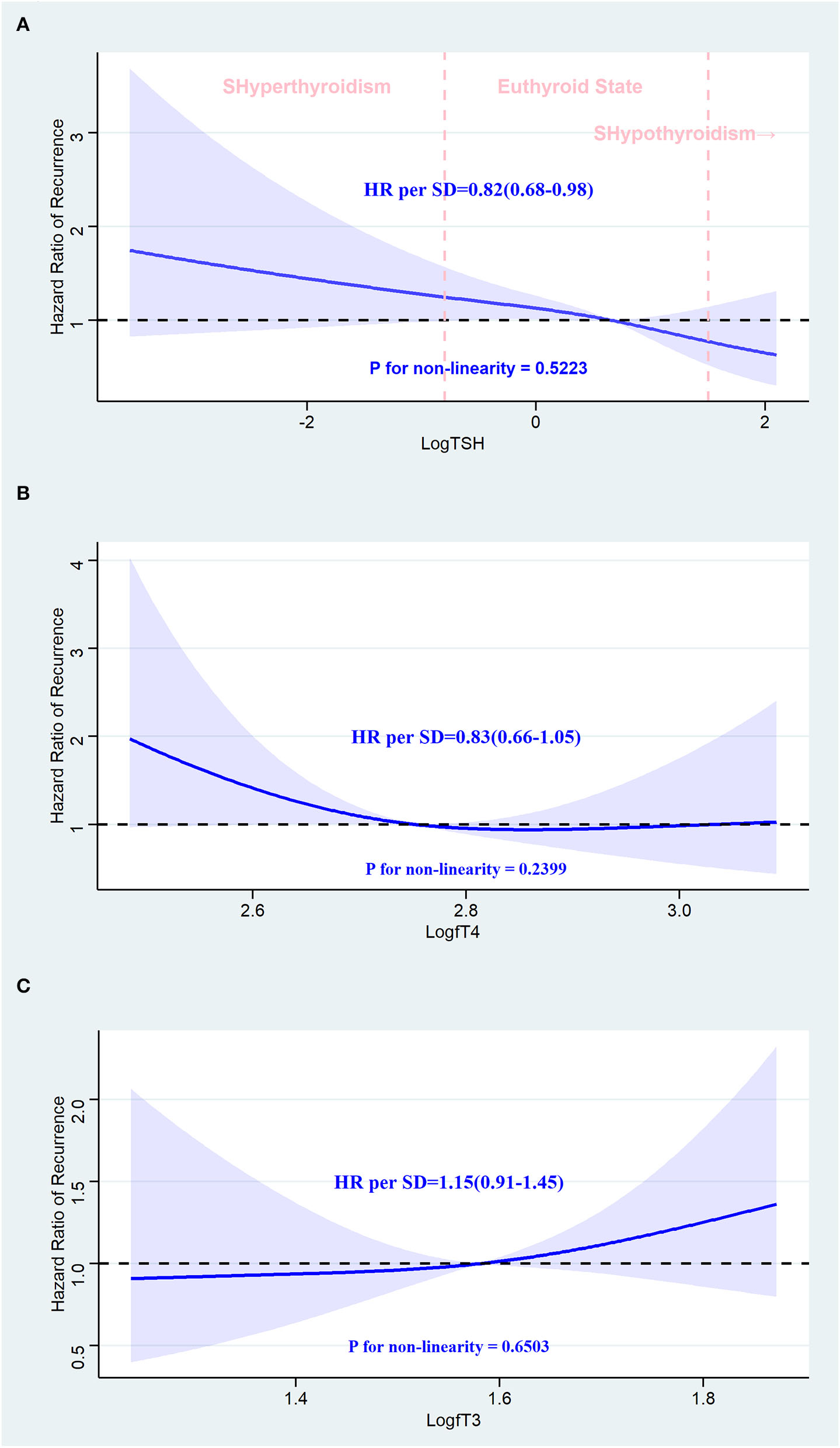 Multivariate Cox proportional hazards regression models were used to estimate the hazard ratio (HR) of recurrence of AF for TSH, fT4, and fT3 concentrations, and similar analyses were conducted for TSH, fT4, and fT3 quintiles. Both the unadjusted and the fully adjusted models were reported. Due to the skewness of the distribution, TSH, fT4, and fT3 were modeled with Log transformation, and SD units centered on the mean were reported to make TSH, fT3, and fT4 values comparable and interpretable across studies. At the same time, the untransformed outcomes are presented in the Supplementary Materials. We used restricted cubic spline curves based on Cox proportional hazards models with 3 knots at the 10th, 50th, and 90th percentiles of TSH, fT4, and fT3 to flexibly model the association of TSH, fT4, and fT3 with the recurrence of AF. Spline regression analyses were adjusted for potential confounders. In the spline models, the potential non-linearity was evaluated using the likelihood ratio test comparing the models, namely, linear and non-linear (23).