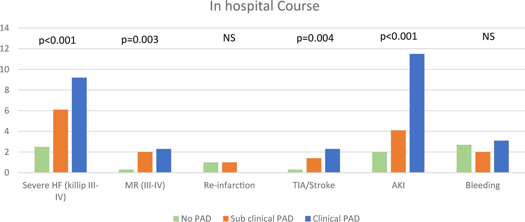 In-hospital course. The figure demonstrates the frequency of in-hospital complications according to the pre-specified groups. The chi-square test for trend was used. AKI, acute kidney injury; MR, mitral regurgitation; PAD, peripheral arterial disease; TIA, transient ischemic attack.