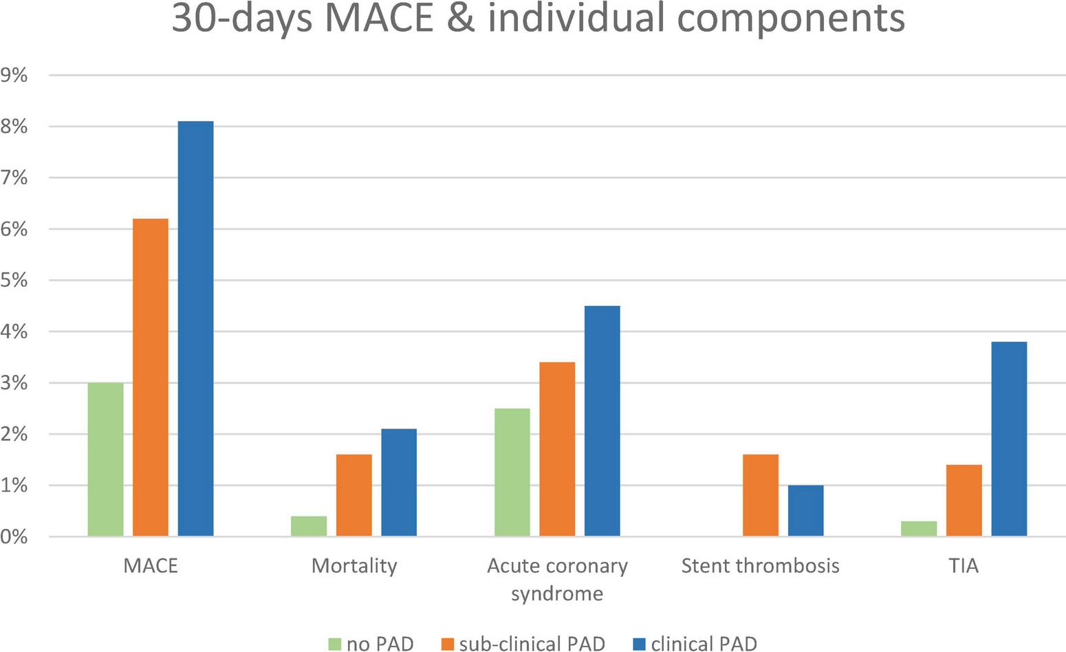 A 30-day MACE, individual components, and bleeding according to pre-specified groups: no-PAD (green), subclinical PAD (orange), and clinical PAD (blue). MACE, major adverse cardiovascular event.