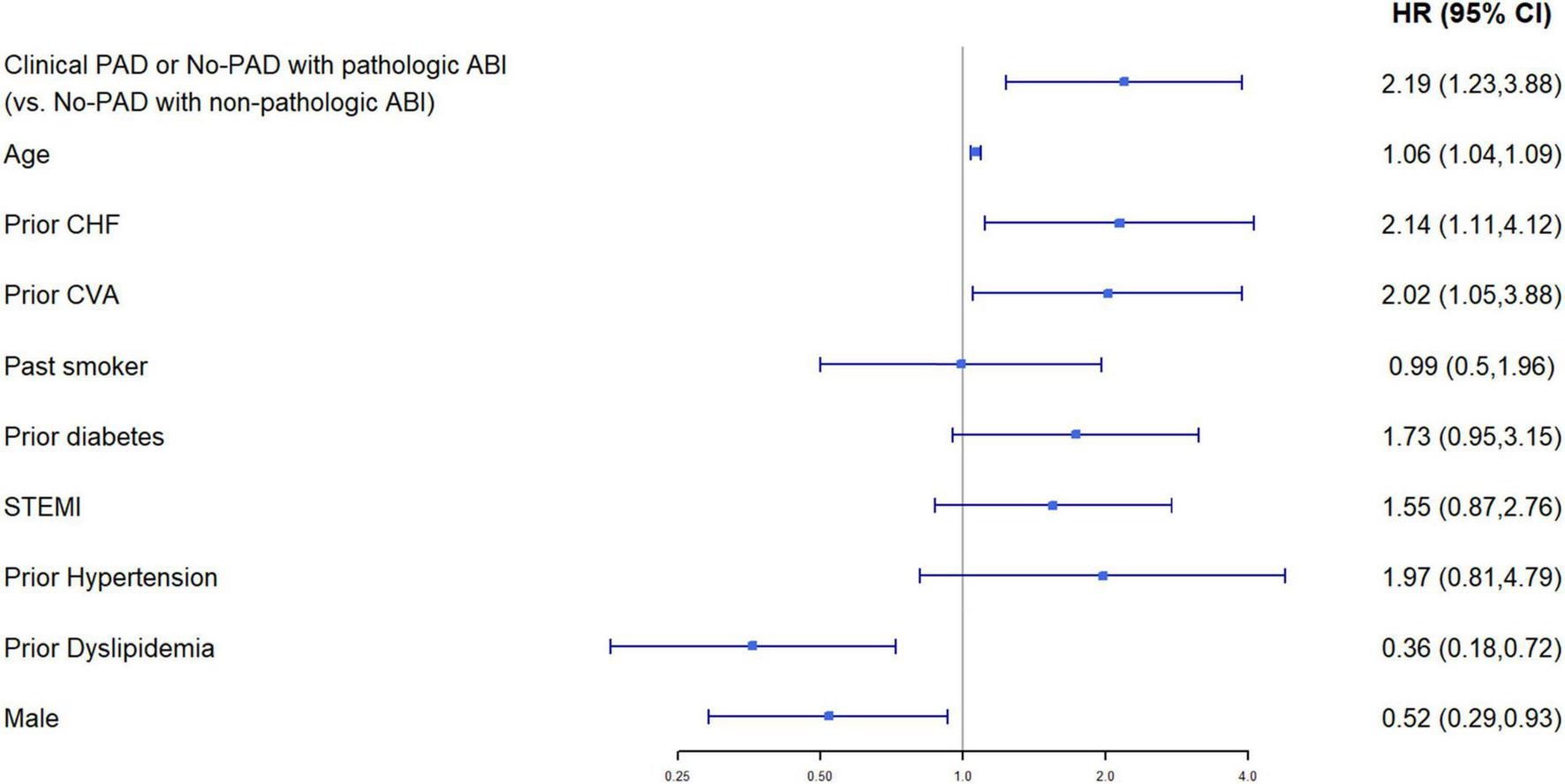 Multivariable Cox proportional hazard model for 1-year mortality (95%CI). Baseline characteristics (p < 0.05 for comparison between the groups of clinical PAD or no PAD with pathological ABI, vs. no PAD with non-pathological ABI) were chosen as covariates. Model’s data contain only patients with non-missing values in these variables, N = 1,035 patients.