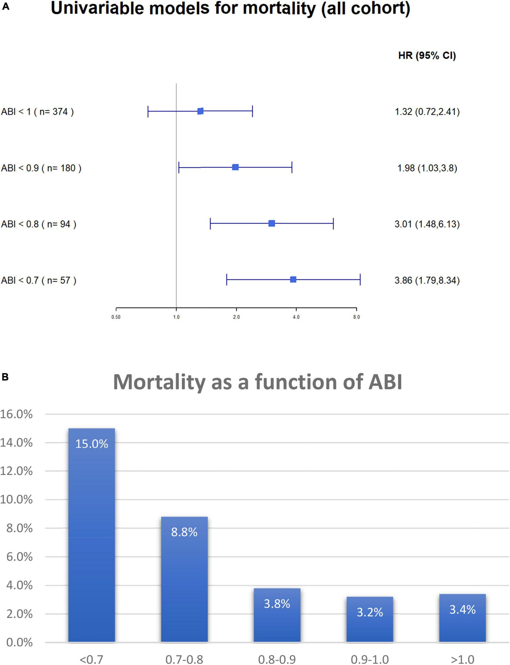 (A) Univariable Cox proportional hazard models for 17-months (maximal follow-up time) all-cause mortality according to ABI value. The figure demonstrates the difference in mortality according to ankle-brachial index cutoff points. N in each model (shown in parenthesis) regards to the number of patients with ABI less than 1, 0.9, 0.8, and 0.7 accordingly. ABI, ankle-brachial index. (B) Overall mortality according to ABI groups. ABI, ankle-brachial index.