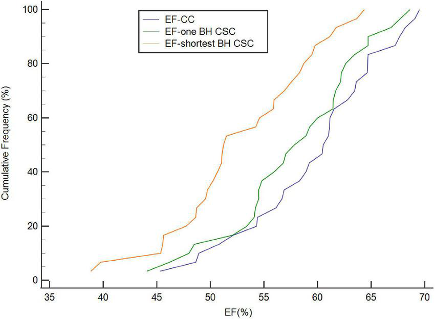 Cumulative frequency distribution of EF calculated by CC, one BH CSC, and shortest BH CSC acquisitions. EF calculated by both one BH CSC and shortest BH CSC acquisitions correlated well with that calculated by CC acquisition (ICC = 0.955 and 0.836, respectively).