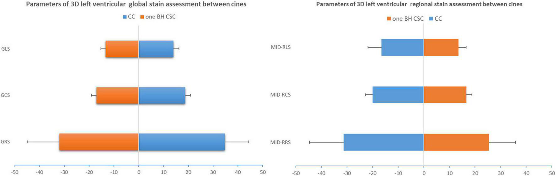 3D global strain and mid-regional strain computed by CC and one BH CSC protocols. ICCs of GRS, GCS, and GLS were greater than 0.8, and CVs of GCS and GLS were lower than 15%. ICCs were moderate (0.6 < ICC < 0.8) for mid-regional strain, but CVs were more than 15%.