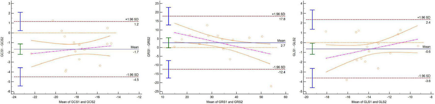Bland–Altman plot indicating that 95% or more dots were located in 95% confidence interval for GCS, GRS, and GLS between CC and one BH CSC protocols.