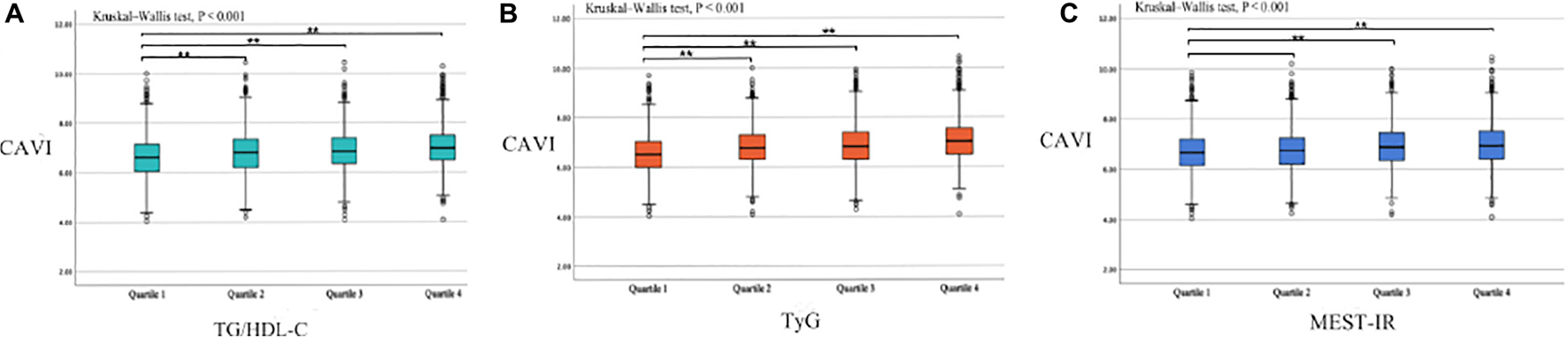 Table 1 shows the baseline subject demographics and clinical characteristics according to whether CAVI was < 8.0 or ≥ 8.0. Subjects with a CAVI ≥ 8.0 were older, had higher BMI, SBP, DBP, FPG, UA, creatinine, TG, TC, and LDL-C values, and were more likely to be male, smokers, and consumers of alcohol, and to have prehypertension and DM history. There was no statistically significant between-group difference in height, weight, HDL-C level, or the proportion with hyperuricemia or renal dysfunction. We found that the CAVI increased with increasing non-insulin-based IR index values. The median CAVI (interquartile range) values were 6.60 (6.05–7.15), 6.80 (6.20–7.35), 6.85 (6.35–7.40), and 7.00 (6.50–7.50) for TG/HDL-C quartiles (P < 0.001), 6.50 (6.00–7.05), 6.80 (6.30–7.30), 6.85 (6.30–7.40), and 7.05 (6.50–7.55) for TyG quartiles (P < 0.001), and 6.65 (6.15–7.20), 6.75 (6.20–7.25), 6.90 (6.35–7.45), and 6.95 (6.40–7.50) for METS-IR quartiles (P < 0.001). The relevant information is shown in Figure 1.