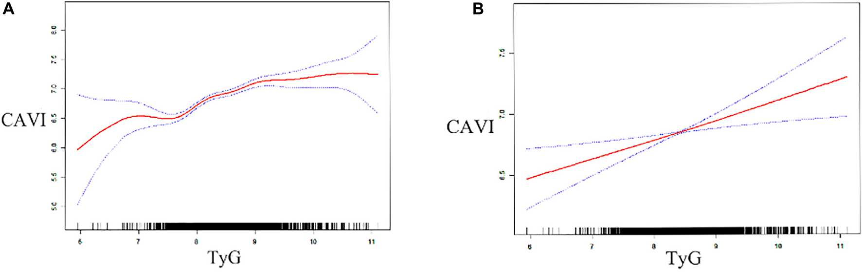 Continuous data with a normal distribution are expressed as the mean ± standard deviation (SD) and those with an abnormal distribution are shown as the median (interquartile range). Categorical variables are expressed as the frequency (percentage). Continuous data were compared using the independent-samples t-test, Mann–Whitney U-test, or Kruskal–Wallis test. Differences in categorical variables were compared among the groups using the chi-squared test. Bivariate Spearman’s and partial correlation analyses were used to detect the relationship between each non-insulin-based IR index and CAVI. We also standardized the non-insulin-based IR indices and entered them into linear regression models to explore the association between the increases in TG/HDL per SD, TyG per SD, METS-TR per SD, and CAVI. The positive relationship between TyG and CAVI was then validated using a generalized additive model with smoothness of fit. The three non-insulin-based IR indices (TG/HDL-C, TyG, and METS-IR) were also divided into quartiles, and the lowest quartile was used as a reference. This categorization was performed as follows: quartile 1 (Q1): ≤ 0.503, quartile 2 (Q2): 0.504–0.760, quartile 3 (Q3): 0.761–1.217, and quartile 4 (Q4): ≥ 1.218 for TG/HDL-C; Q1: ≤ 7.980, Q2: 7.981–8.331 Q3: 8.332–8.759, and Q4: ≥ 8.760 for TyG; and Q1: ≤ 27.241, Q2: 27.242–30.837, Q3: 30.838–35.504, and Q4: ≥ 35.505 for METS-IR. The relationship between the quartiles for each non-insulin-based IR index and increased arterial stiffness (CAVI ≥ 8.0) was then examined by multiple logistic regression analysis after adjusting for confounding factors. Finally, the ability to detect increased arterial stiffness (CAVI ≥ 8.0) was compared between TG/HDL-C, TyG, and METS-IR using receiver-operating characteristic (ROC) curve analysis. Furthermore, the optimal cutoff value, Youden index (YI), sensitivity, and specificity were calculated for each index. All statistical analyses were performed using SPSS version 26.0 (IBM Corp., Armonk, NY, United States) or EmpowerStats (X&Y Solutions, Inc., Boston, MA, United States). A P-value < 0.05 was considered statistically significant.