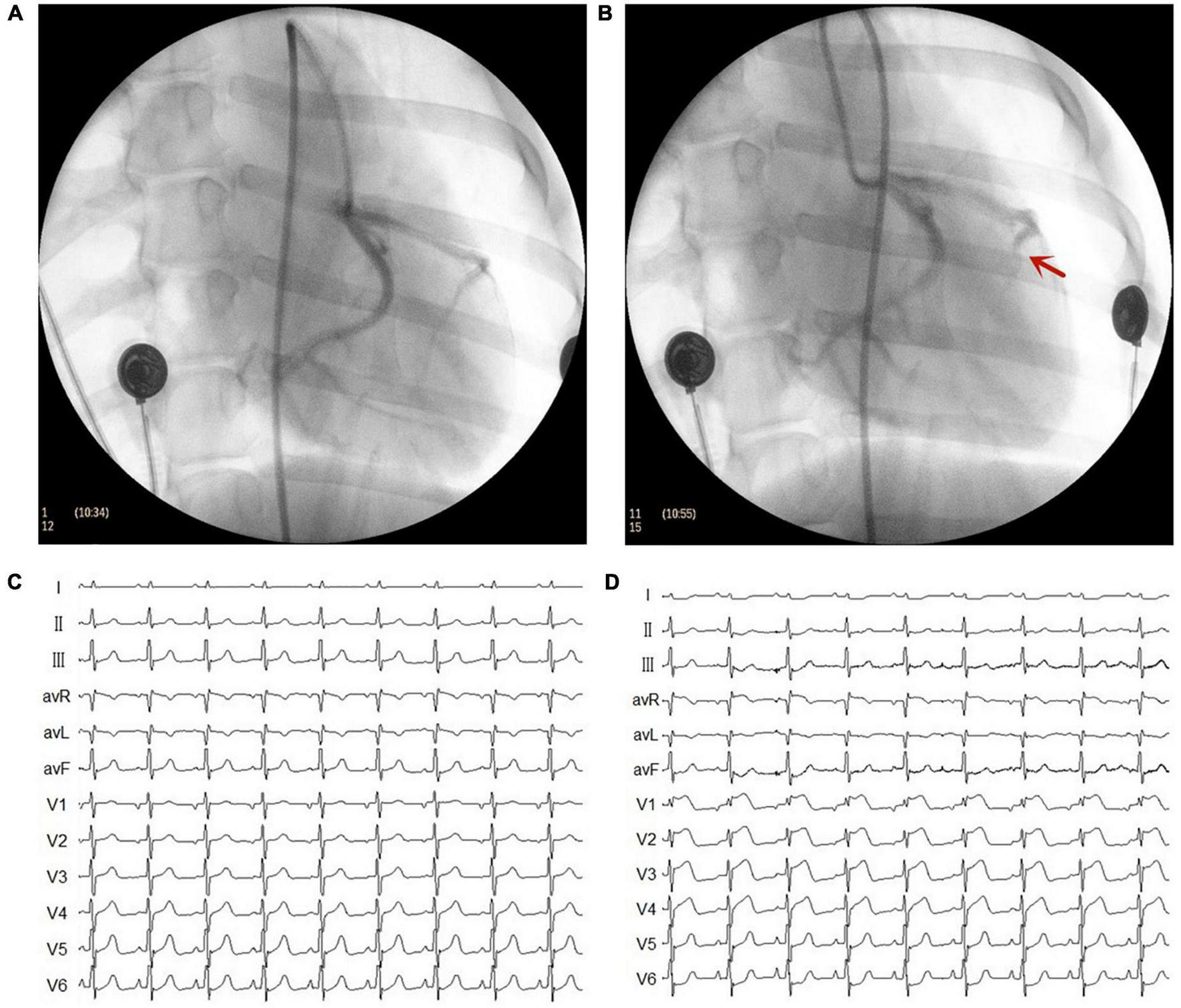 Representative images of X-ray and electrocardiogram (ECG) changes during the myocardial infarction (MI) model. (A) Left coronary artery arteriography before gelatin sponge injection. (B) Left coronary artery arteriography after gelatin sponge injection. Notably, the distal anterior descending artery had obvious stenosis. (C) ECG before gelatin sponge injection. (D) ECG after gelatin sponge injection, the chest lead ST segment was elevated.