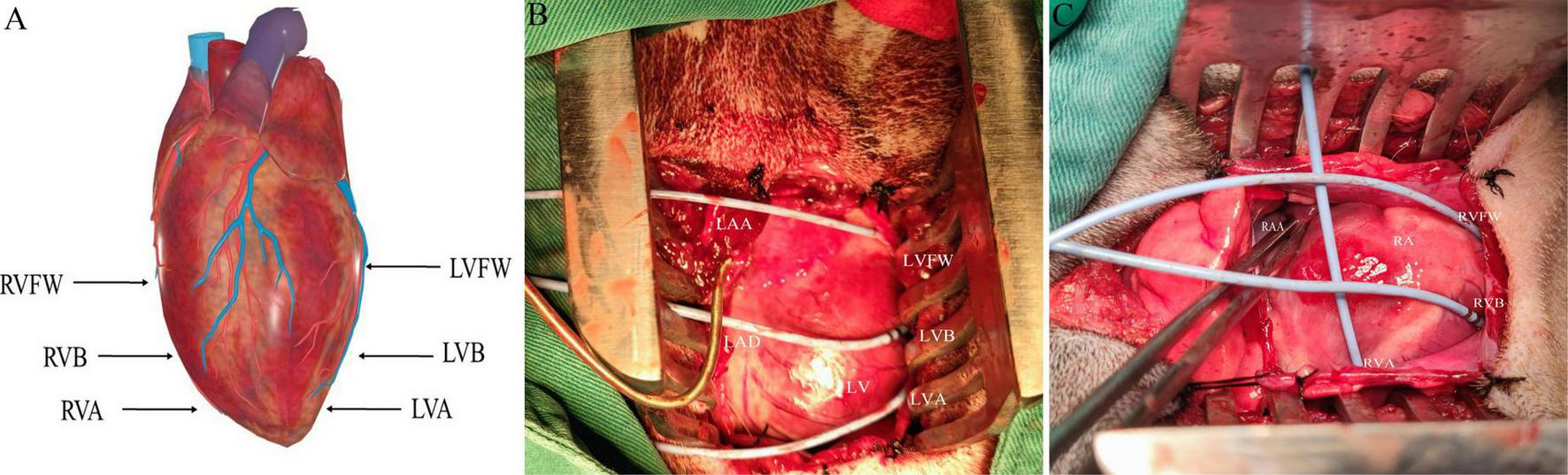 The schematic diagram of electrode placement position during electrophysiological testing (A). (B,C) Are electrodes placed in the left ventricle and right ventricle, respectively. LVFW, left ventricular free wall; LVB, left ventricular base; LVA, left ventricular apex; LAA, left atrial appendage; RVFW, right ventricular free wall; RVB, right ventricular base; RVA, right ventricular apex; RAA, right atrial appendage.