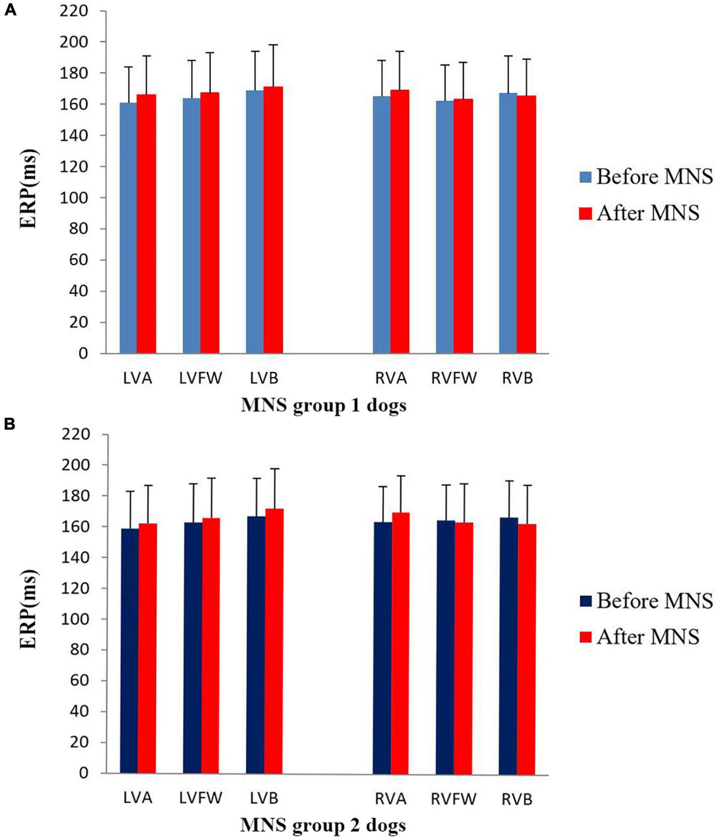 Changes in the ventricular effective refractory period (ERP) before and after median nerve stimulation. (A) MNS group 1 and (B) MNS group 2. No significant difference in the ERP before and after MNS in the MNS group 1 and MNS group 2 dogs. MSN, median nerve stimulation.