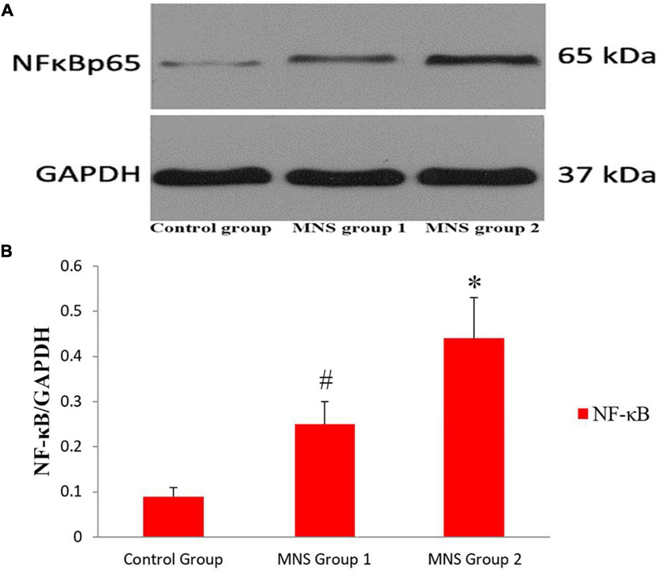 We compared Western blot results of ventricular tissues from the three groups (Figure 6). All immunoblot band intensity measurements were normalized to the intensity of the GADPH band in the loaded sample. Of note, the levels of NF-κB protein in the ventricular samples were significantly higher in the MNS group 2 than in the control group (0.44 ± 0.09 vs. 0.09 ± 0.02, P < 0.01) and in the MNS group 1 (0.44 ± 0.09 vs. 0.25 ± 0.05, P < 0.01). Compared to the control group, NF-κB protein expression was higher in the MNS group 1 (0.25 ± 0.05 vs. 0.09 ± 0.02, P < 0.01).