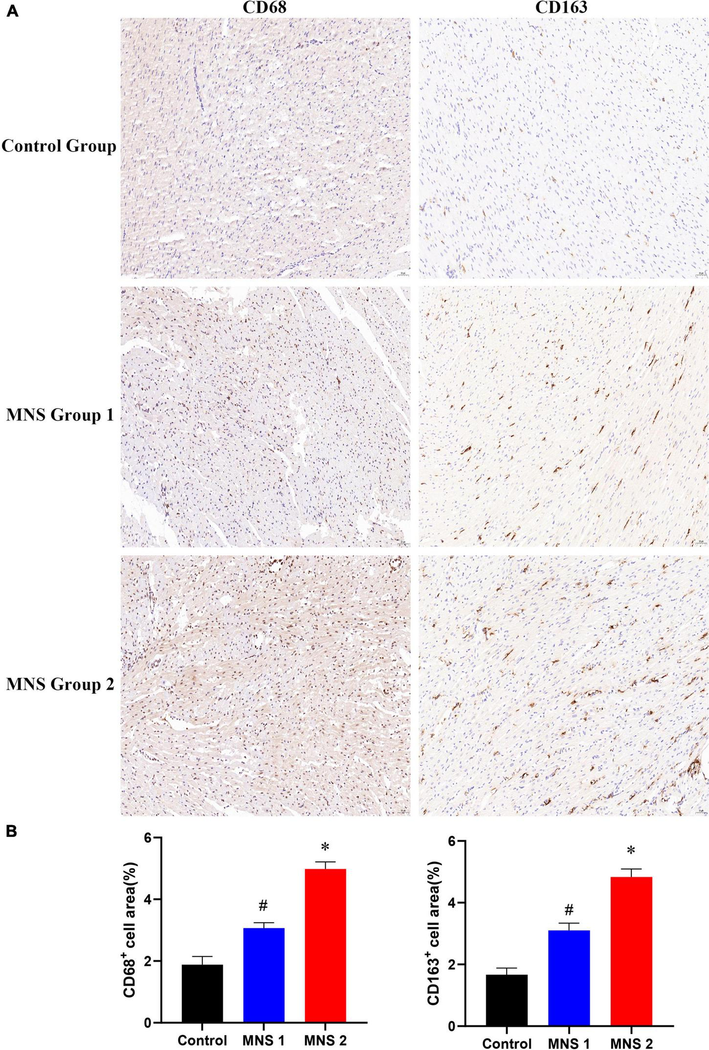 Tissues were obtained from the peri-infarct zone of LV for immunohistochemical analysis. We used CD68 (Boster, BA3638, CA, USA) and CD163 (Abcam, ab182422, Cambridge, UK) antibodies for immunohistochemical staining. The tissues were stained in the same session. We determined staining densities by a computer-assisted image analysis system (Image-Pro Plus 3.0, USA).