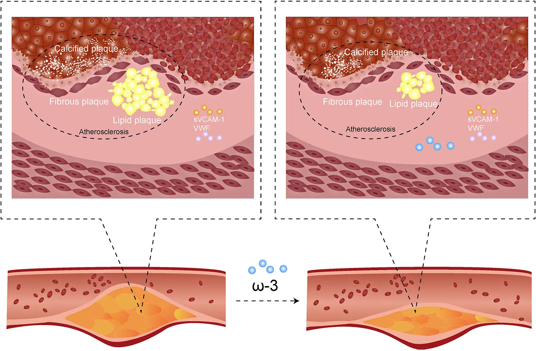 In order to increase the exposure of our work, we made a graphical abstract: ω-3 PUFAs (ω-3 polyunsaturated fatty acid) reduce coronary atherosclerotic plaques growth and relieve the lesions process of the most stenotic segment of the coronary artery. However, the effects on all main compositions of atherosclerotic plaques (fiberboard, calcified plaque, and lipid plaque) are not statistically significant. Serum soluble vascular cell adhesion molecule-1 (sVCAM-1) level and activation percentage of von Willebrand factor (VWF%) are not significantly affected. The mechanism of ω-3 PUFAs on coronary atherosclerosis may need further studies.