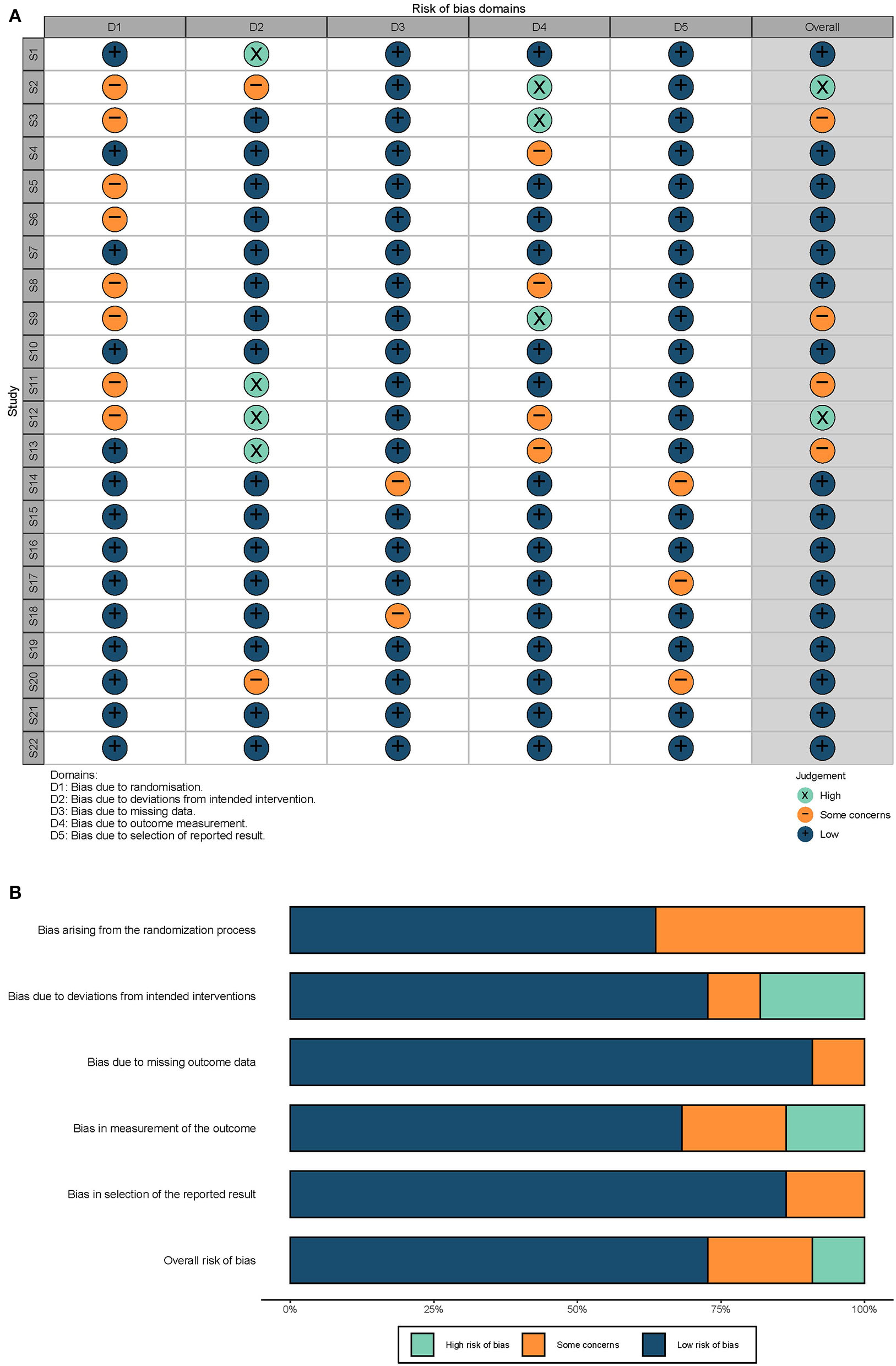 Quality evaluations. (A) Risk biases of each study. S1–S22: 22 studies included in this review, serially. The overall risk was evaluated based on the criteria described previously. (B) Summary of risk biases. The length of each color represents the proportion of the risk.