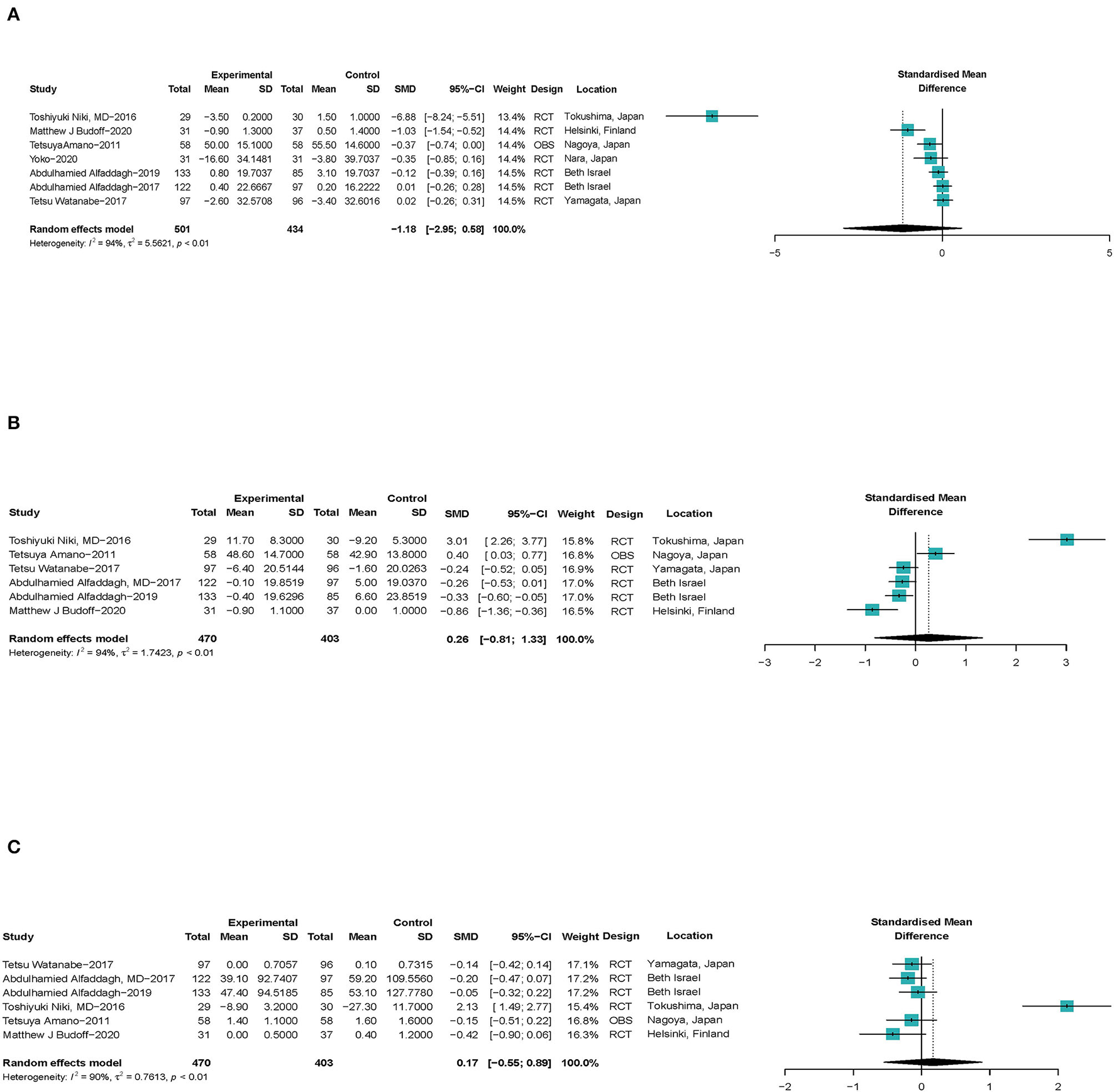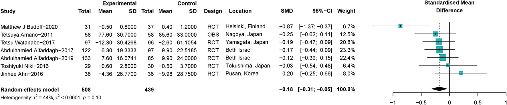 Literature were from online databases. Randomized controlled trials (RCTs) or observational studies were acceptable. Quantitative data synthesis was conducted using R version 4.1.2. Each outcome was calculated using standardized mean difference (SMD) in a random-effect model. Sensitivity analysis was conducted for each outcome. A total of 21 RCTs and 1 observational study with 2,277 participants were included.