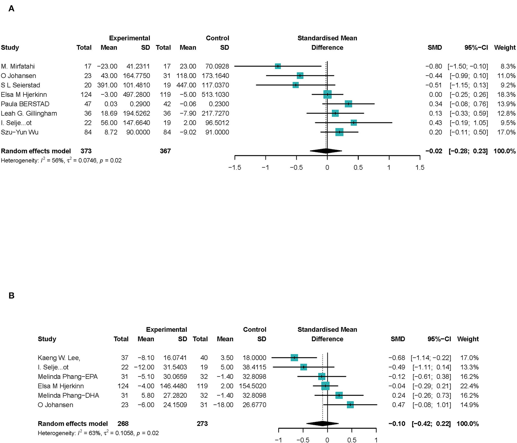 | S. L. Seierstad (40) | 2005 | 58 [46-74] | 17 [85%] | 20 | 63 [52-75] | 18 [94.7%] | 20 | DHA | Placebo | g. | NA |