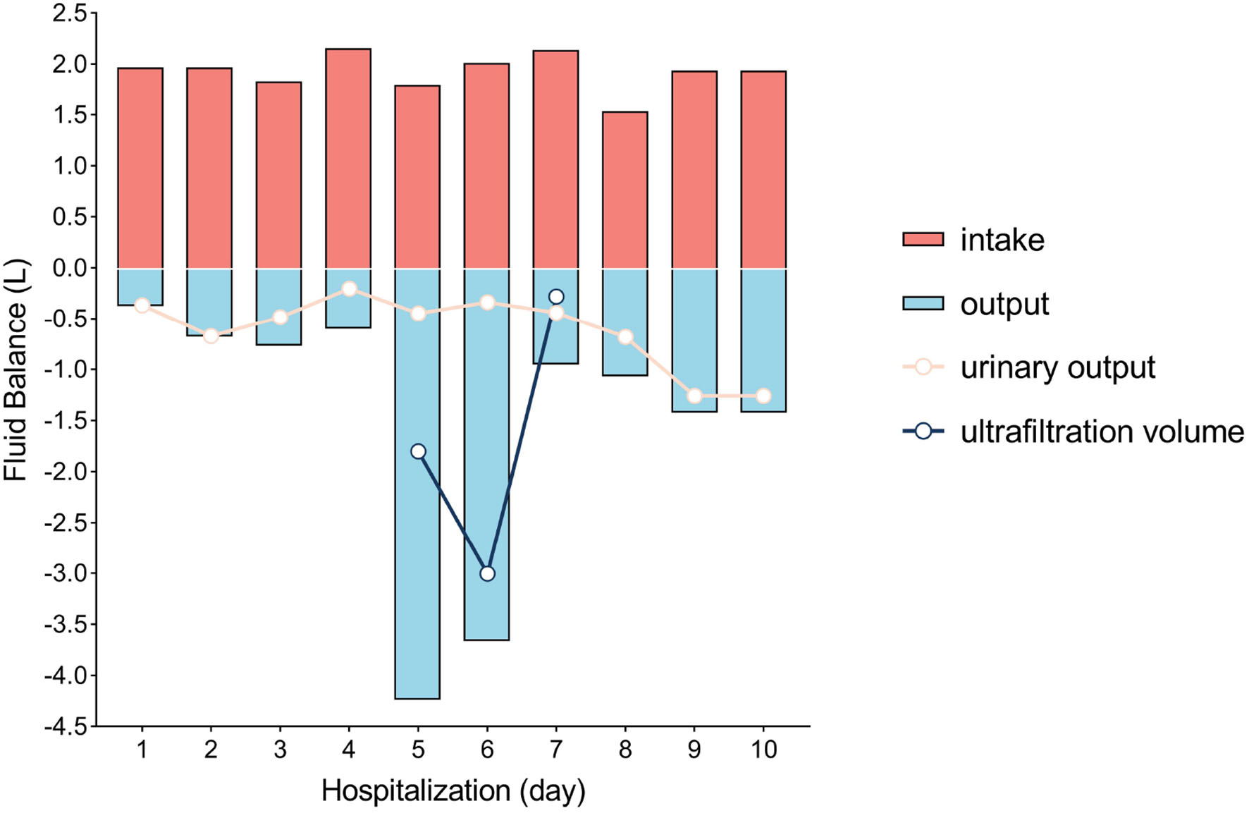 Fluid balance in the first 10 days of hospitalization. Day 1 was defined as the time between hospital admission and the next morning (14 h).