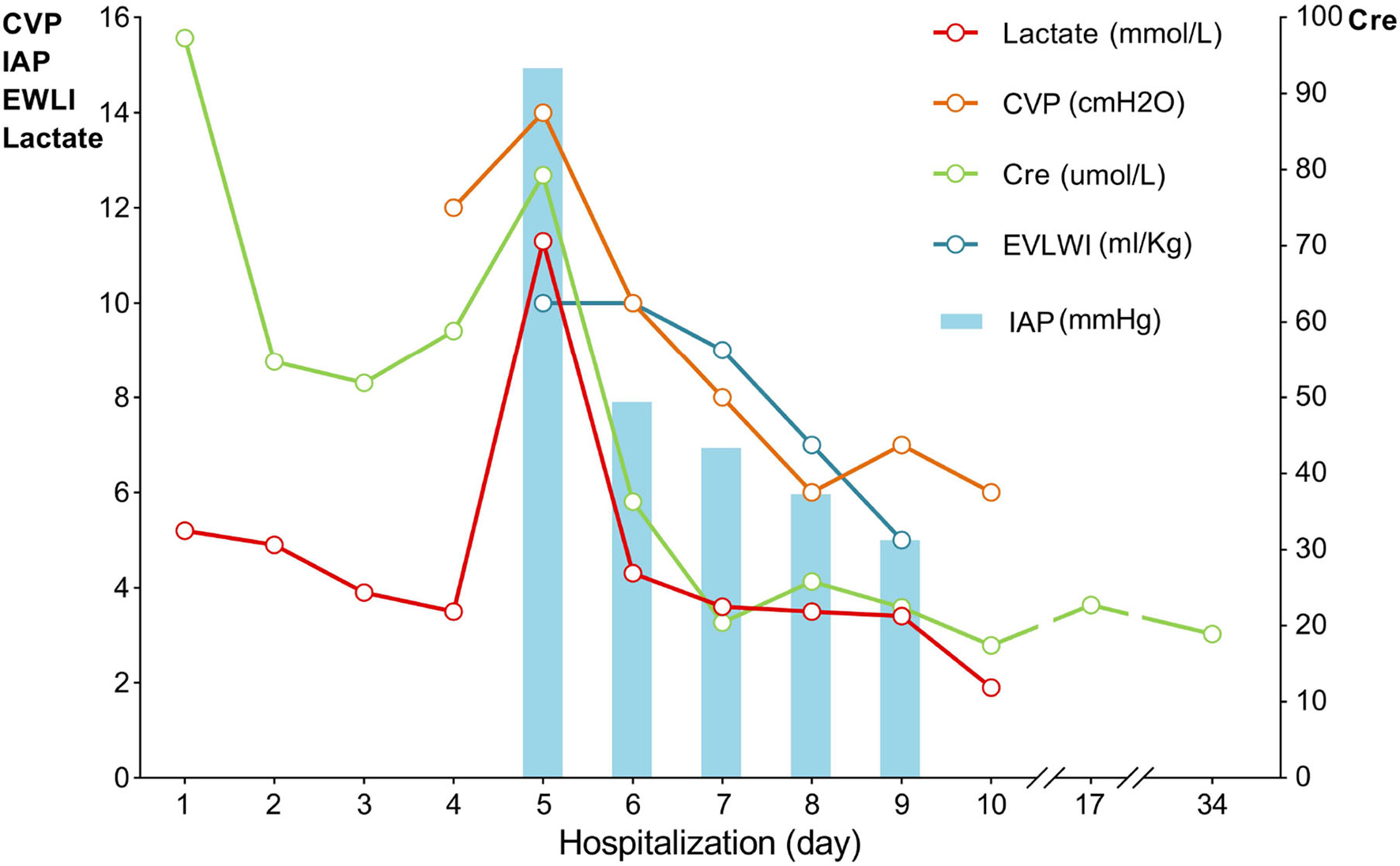Trends of vital parameters during hospitalization. CVP, central venous pressure; IAP, intra-abdominal pressure; EVLWI, extravascular lung water index; Lac, lactate, Cre, serum creatinine.
