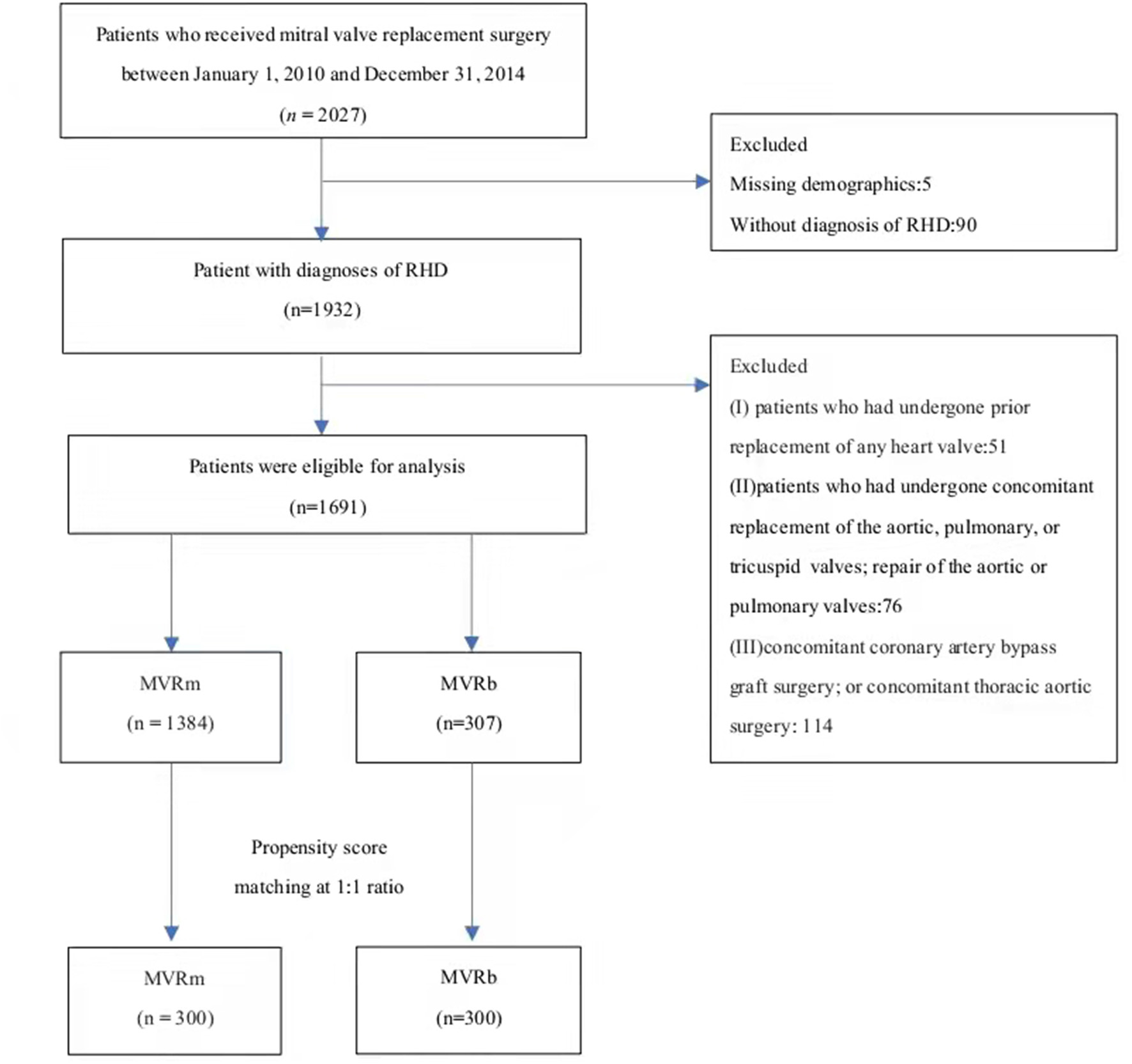 The flowchart of patient inclusion and exclusion. RHD, Rheumatic heart disease. MVRm, mechanical mitral valve replacement; MVRb, bioprosthetic mitral valve replacement.