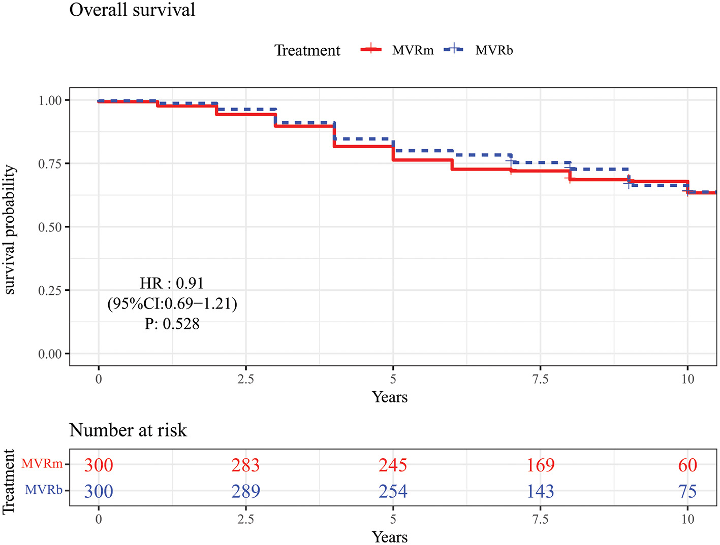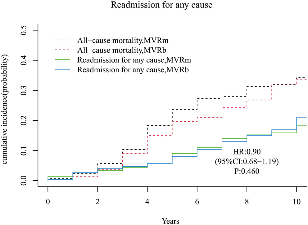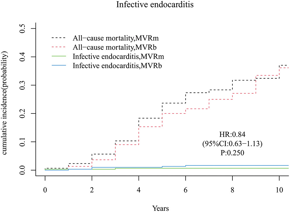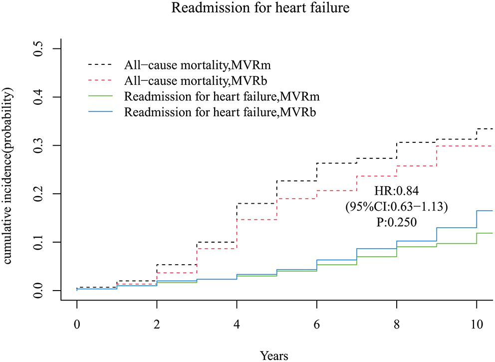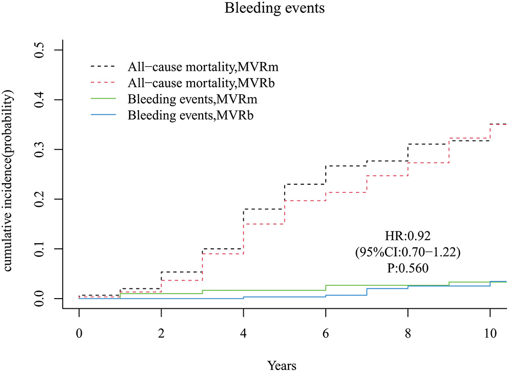Ten-year survival after MVR was 63.4% in the MVRm group and 63.7% in the MVRb group (HR, 0.91; 95% CI, 0.69–1.21; P = 0.528). The cumulative incidence of mitral valve reoperation was 0.0% in the MVRm group and 1.2% in the MVRb group (HR, 0.92; 95% CI, 0.69–1.21; P = 0.530). The cumulative incidence of stroke was 5.5% in the MVRm group and 6.1% in the MVRb group (HR, 0.89; 95% CI, 0.67–1.18; P = 0.430). The cumulative incidence of major bleeding events was 3.3% in the MVRm group and 3.4% in the MVRb group (HR, 0.92; 95% CI, 0.70–1.22; P = 0.560).