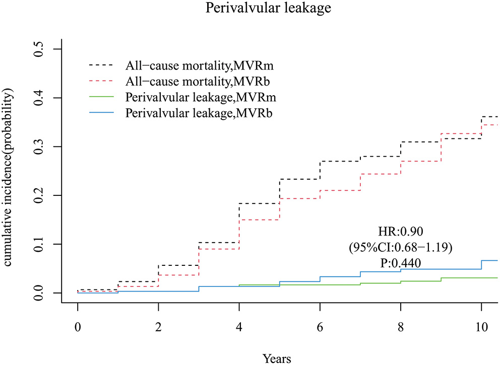 A total of 8 moderate or severe perivalvular leakage occurred in the MVRm and 17 perivalvular leakage occurred in the MVRb during follow up. There was no significant difference between the 2 groups [hazard ratio (HR), 0.90 (95% CI, 0.68–1.19), P = 440; Figure 10]. The cumulative incidence of moderate or severe perivalvular leakage at 3, 5, 7, and 10 years were 1.3, 1.7, 2.0, and 3.1% in the MVRm, and 1.3, 2.3, 4.4, and 6.7% in the MVRb, respectively.