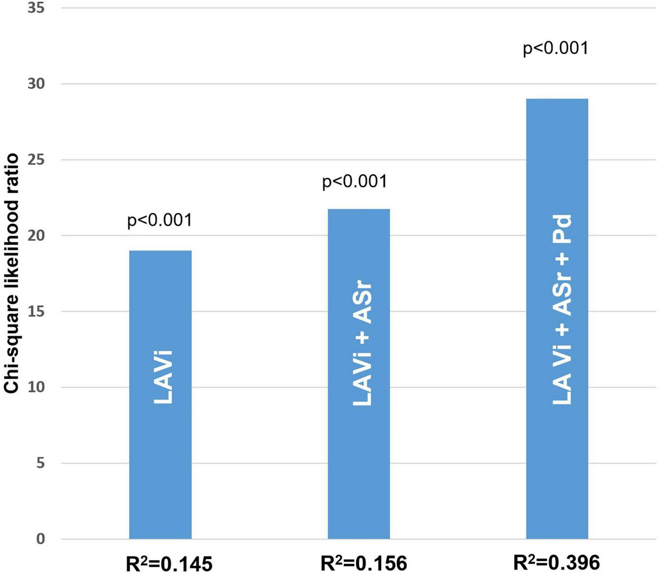 Figure 3. Likelihood ratio test in the whole HCM population. Significant incremental predictive value for new-onset AF when adding ASr, further improving when adding both ASr and Pd (model accuracy of 85%) compared to a standard model taking into account only LA indexed volume (model accuracy of 71%).