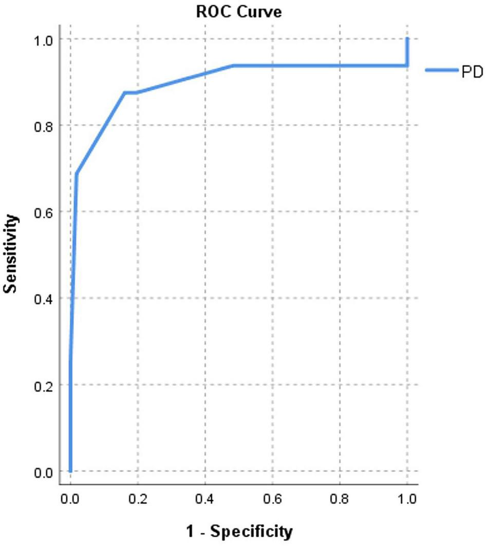 Figure 4. Area under curve (AUC)-based C-statistics for new-onset AF for Pd (AUC = 0.89) in HCM patients with LAD < 45 mm.