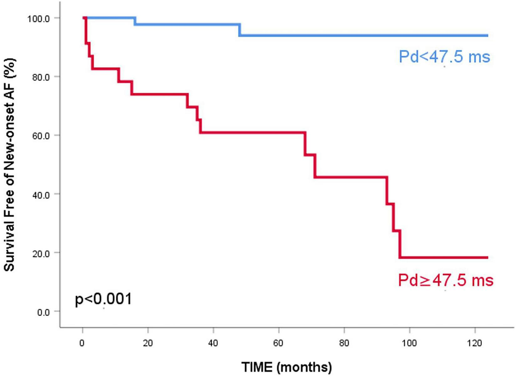 After Cox regression analysis, age, HTN severity, Pd, Pdur max, LADi, LAVi, LA strain, and resting LVOT gradient were univariate predictors for new-onset AF in this selected group. Pd emerged as the only AF predictor at multivariable analysis (HR = 1.105, 95% CI 1.059–1.154, and p = 0.002), independent of age, LAVi, LA strain, or resting LVOT gradient (Table 5). Exclusion of patients with a history of AF before enrollment did not change the univariable/multivariable analysis results. Pd had good accuracy in predicting AF, for a similar cut-off of 47.5 ms (Table 3 and Figure 4). Patients with a Pd < 47.5 ms had a better survival free of AF than patients with Pd ≥ 47.5 ms (Figure 5).