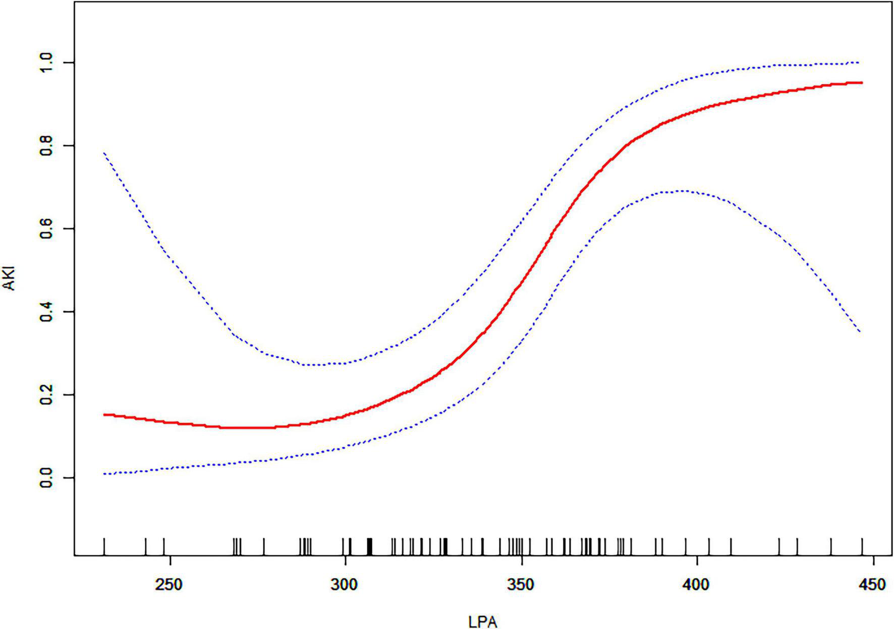We measured the plasma concentration of LPA in a cohort of 80 patients with AAD. Least Absolute Shrinkage and Selection Operator (LASSO) regression and Logistic regression were used to evaluate the effect and interaction of LPA on AKI. Additive generalized model and penalized spline method were used to describe the non-linear association. Multivariable analyses with the Cox proportional-hazards model were used for subgroup analysis and interaction in LPA and subsequent CKD.