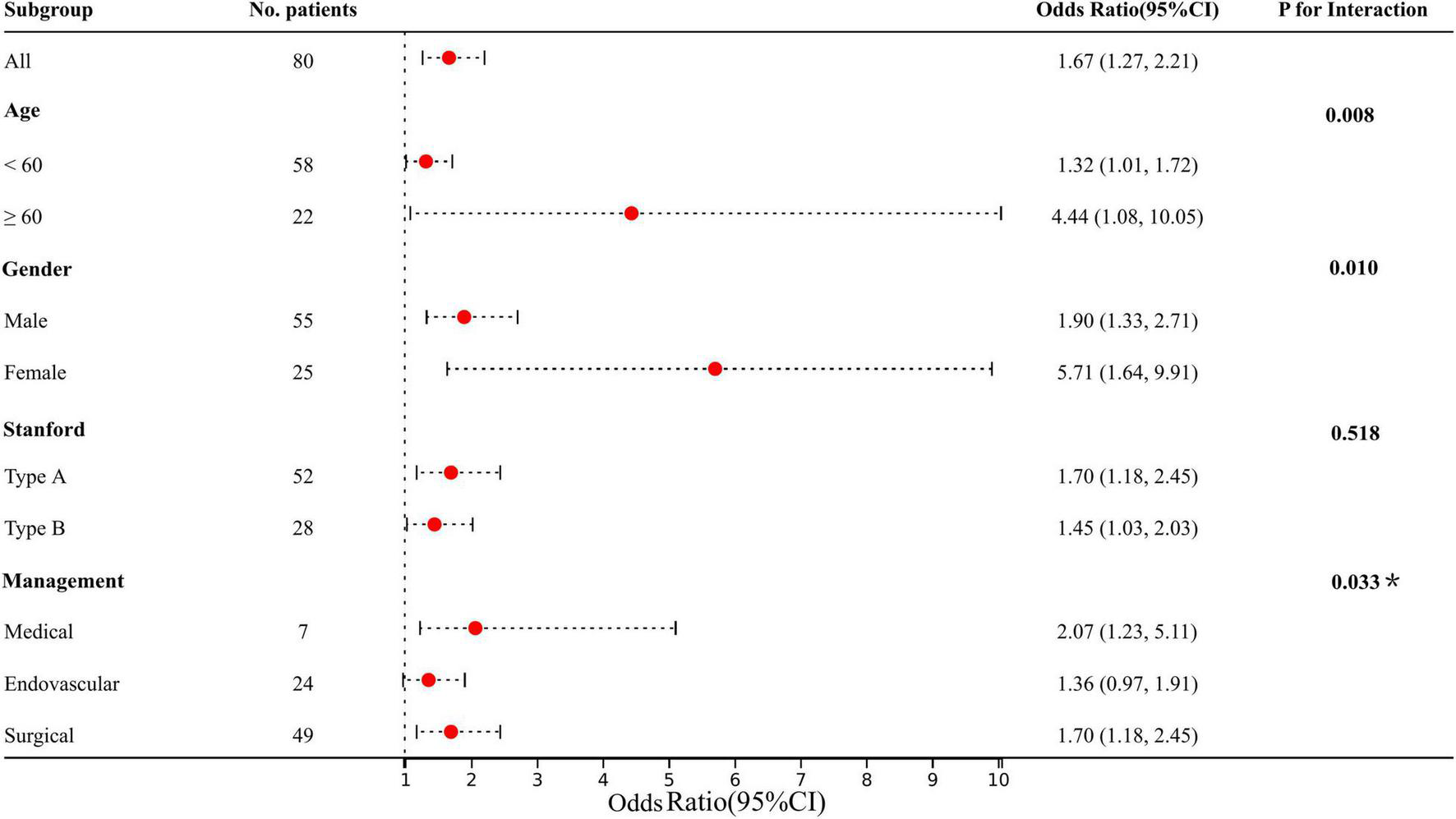 Lysophosphatidic acid (LPA) is a bioactive phospholipid, which can exert diverse biological effects in various diseased states of the kidney by activating at least 6 cognate G-protein coupled receptors and its complex network of heterotrimeric G-proteins (9). LPA, mainly produced by activated platelets, is an early biomarker of thrombosis and coagulation initiation in AAD, reflecting the extent of tearing and ischemia (10). Meanwhile, LPA can also increase fibroblast growth factor-23 (FGF23) in acute and chronic kidney injury levels to promote chronic fibrosis, which is closely associated with subsequent CKD and end-stage renal disease (11). Although, an increasing number of studies have been done to explore the effects of LPA metabolism on renal function (9), the association between LPA and AAD-related AKI has not been investigated yet. The aim of this study is to evaluate the association and interaction of LPA with gender, age, Stanford type, and management on AAD-related AKI and subsequent CKD.