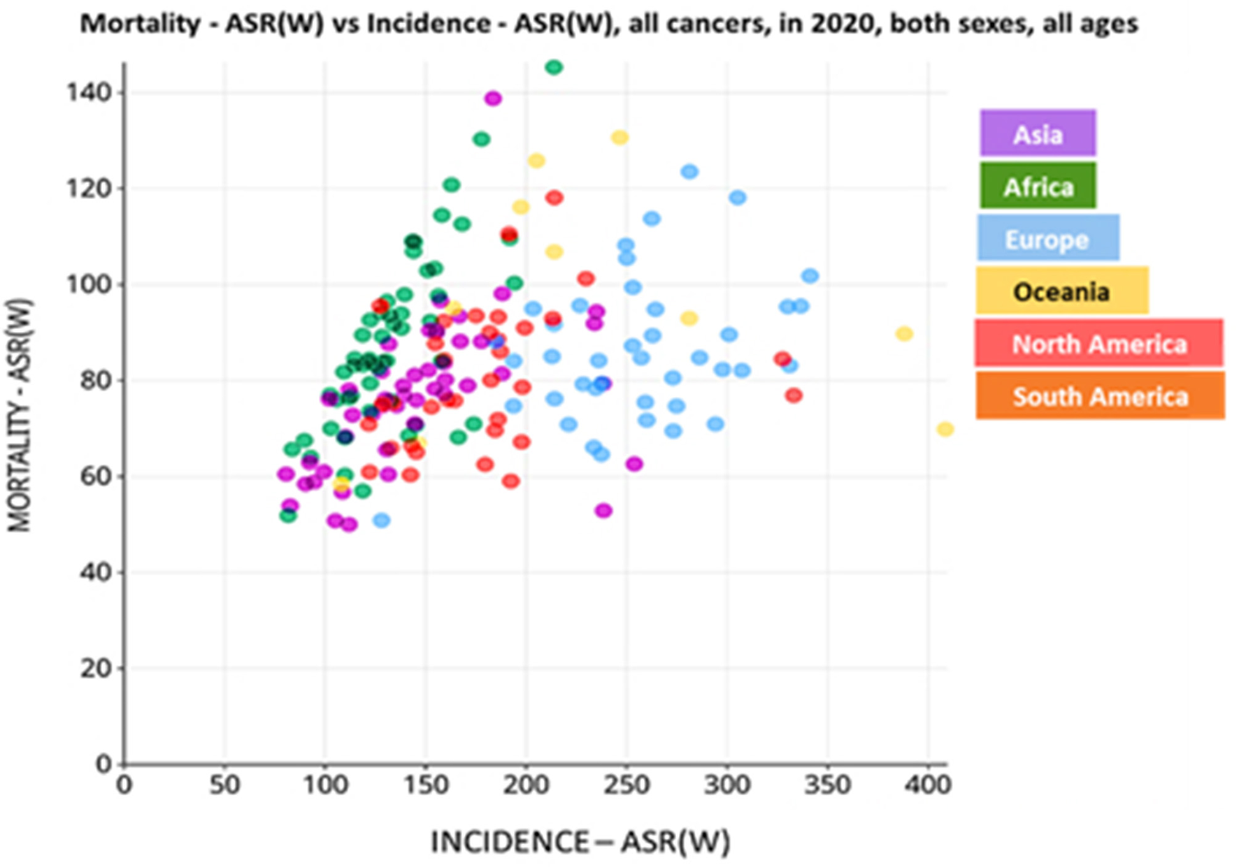 Incidence of cancer-related deaths in the different continents, per 100,000 population. Data is based on the incidence vs. mortality rate of cancer patients in the year 2020. World age-standardized rate [ASR (W)]. Data source: Globocan 2020; World Health Organization (WHO) 2021.