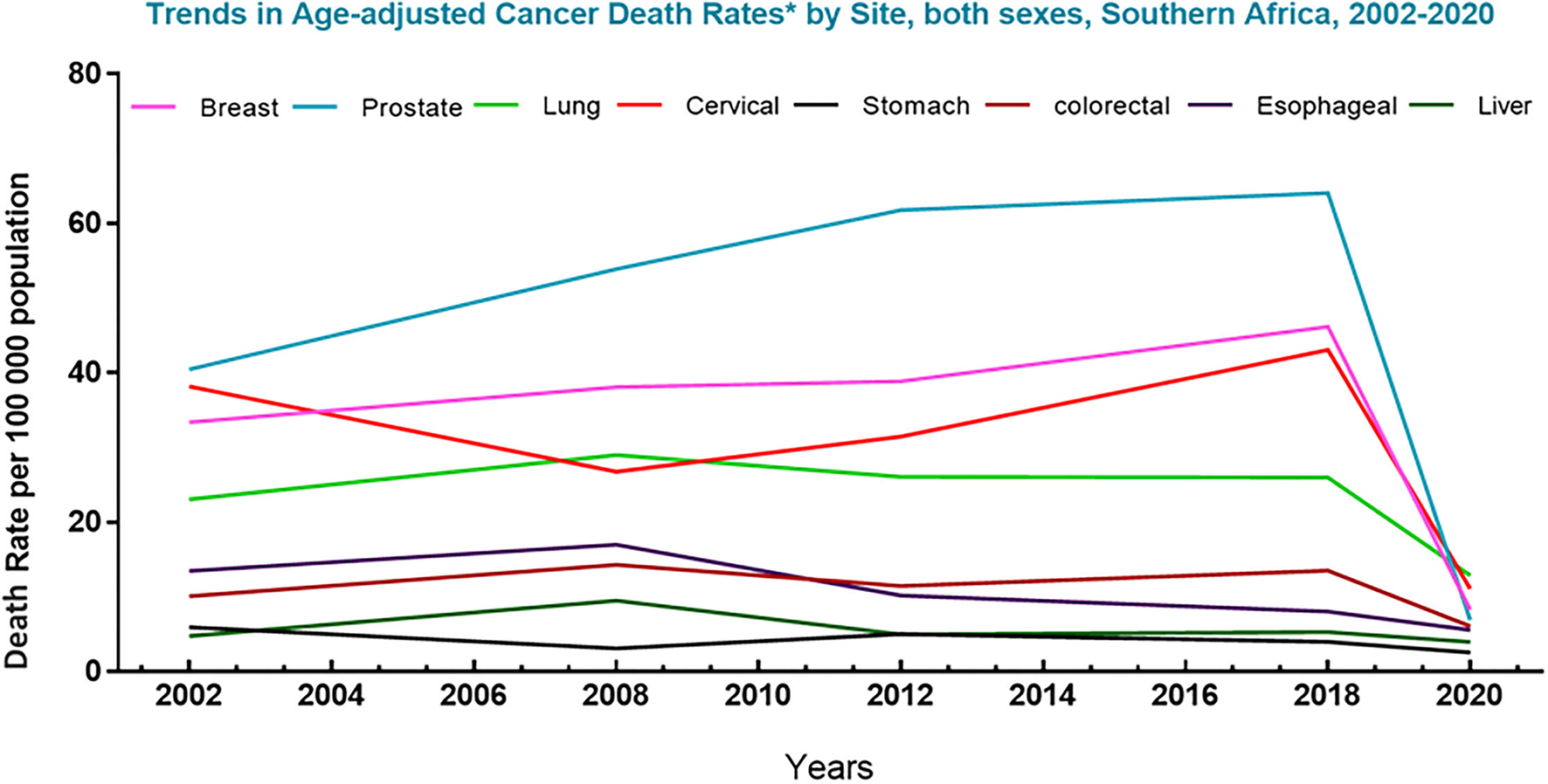Trends in cancer mortality in Southern Africa (2002–2020). Graph represents deaths associated with the top 8 cancers in South Africa for men and women, per 100,000 population, over the last decades. The data shows a sharp decline in the death rate of the top eight cancers in this region. Data source: Globocan 2021; Hamdi et al. (13).