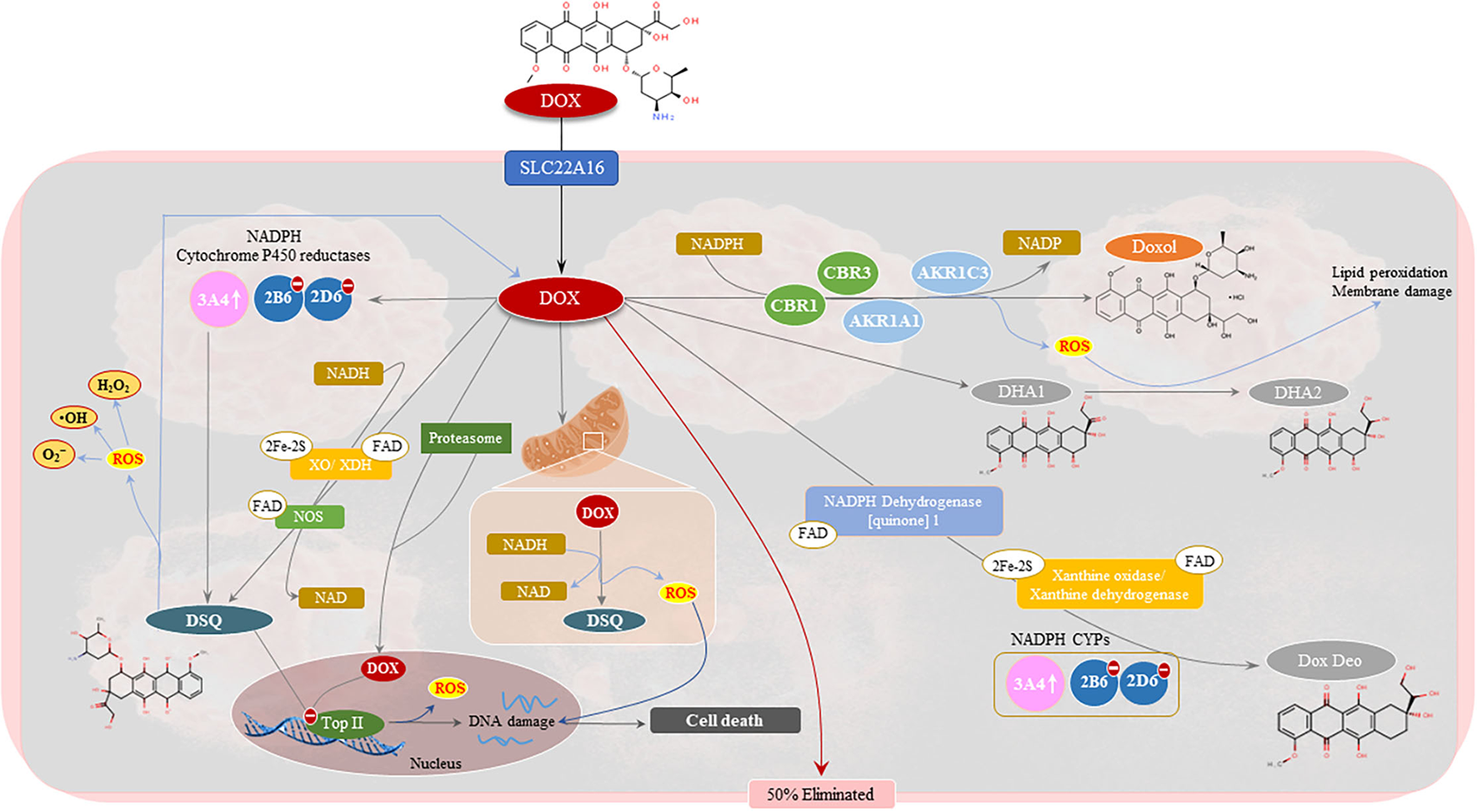 Pharmacology of doxorubicin (Dox). Approximately 50% of Dox is eliminated from the body unchanged. The remaining Dox undergoes three metabolic processes to form doxorubicinol (Doxol), semiquinone radicals (DSQ), and 7-deoxyaglycone and hydroxyaglycone, respectively. The two-electron reduction of Dox forms Doxol via several oxidoreductases namely, carbonyl reductase 1 (CBR1) and 3 (CBR3), and aldo-keto reductases family 1 member (AKR1C3) and AKR1A1, in the presence of nicotinamide adenine dinucleotide phosphate (NADPH). Semiquinone formation entails the one-electron reduction of Dox and is mediated by mitochondrial and cytosolic NADPH dehydrogenates, xanthine oxidase (XO)/dehydrogenase (XDH), NADPH cytochrome P450 (CYPs) reductases and nitric oxide synthases (NOS). Deglycosidation of Dox, in the presence of NADPH-CYPs, XO/XDH and NADPH dehydrogenase. The formation of these metabolites is associated with DNA damage, via topoisomerase II inhibition, and the production of hydroxyl radicals (•OH), superoxide anions () and peroxides (H2O2). This results in the activation of tumoricidal pathways which drive cancer cell death.