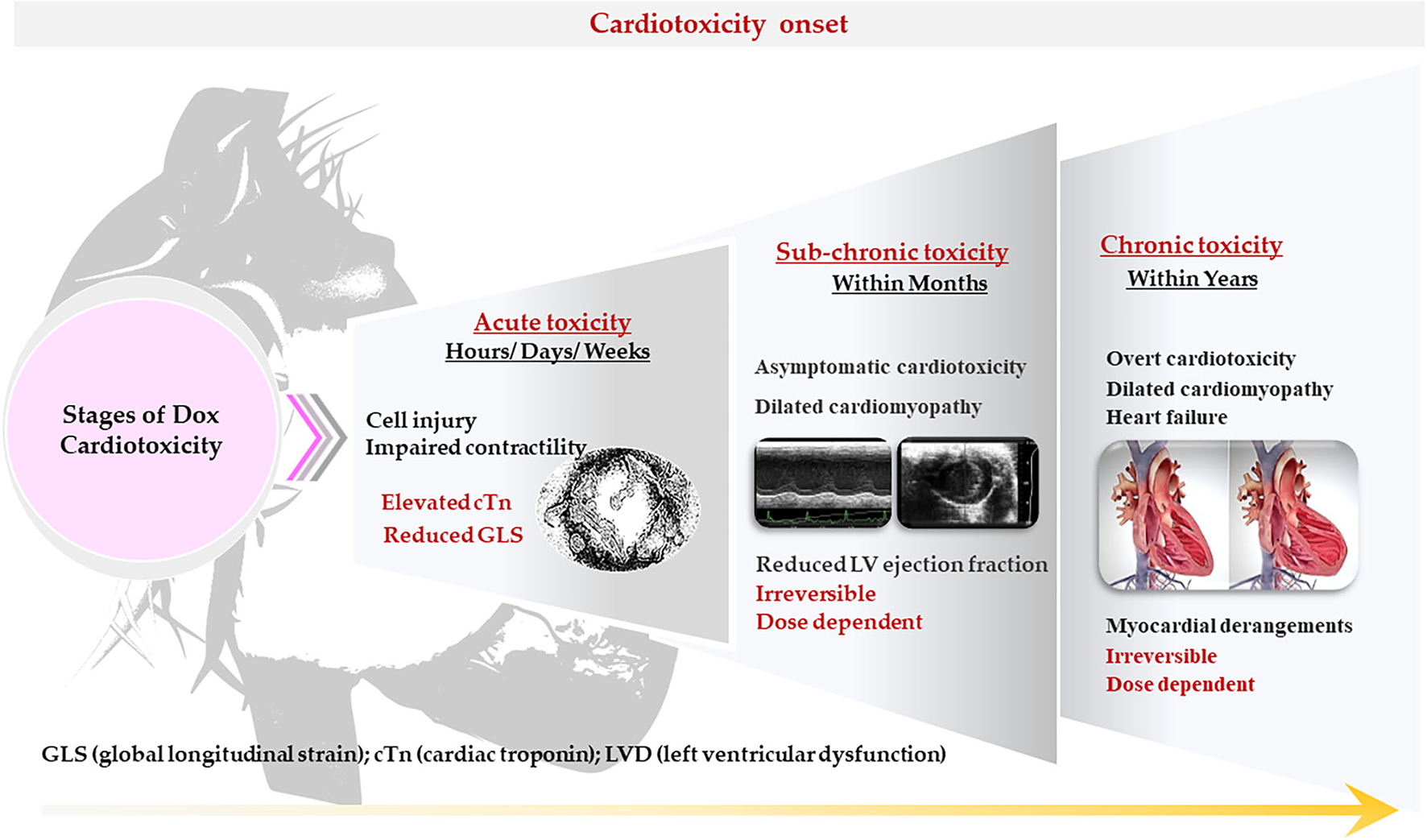 The cardiotoxicity in cancer patients is classified according to the time of onset, severity and characteristic, and may manifest as either acute, sub-chronic (early onset) or chronic (late stage) (Table 2). Often, these patients present with subclinical ventricular dysfunction leading to severe cardiomyopathy and eventually myocardial failure (23). Acute cardiotoxicity, which is the first type and is considered rare, manifests after a single dose or course of chemotherapy, and presents with reversible cardiac impairments during or immediately after treatment cessation administration (25). Sub-chronic cardiotoxicity, which is the second type and the principal form of cardiotoxicity, manifests within a year of chemotherapy and presents with irreversible dilated-hypokinetic cardiomyopathy leaning toward cardiac failure (8). The last and perhaps causing the highest burden is chronic cardiotoxicity, emerging years to decades after the last administered dose of Dox and causes irreversible left ventricular dysfunction (LVD) and eventual heart failure (HF) (Figure 4) (7). On the contrary, Cardinale et al. (8) argued that classifying AIC into different categorizes might be primitive and biased, as these classifications were formulated in the 1980s around retrospective studies based on pediatric cancer survivors and their predisposition to cardiomyopathies (8). The authors explained that instead of being different entities, occurring at different times, AIC may be a continuous phenomenon that progresses from myocardial cellular injury to cardiac deformities which progress into asymptomatic cardiotoxicity, and eventually lead to overt HF. This view is supported by reports of increased cardiac troponin (cTn) levels with a concomitant reduction in global longitudinal strain (GLS) soon after the first administered dose of Dox. Beyond their ability to aid in diagnosing myocardial infarction, cTn often precede DIC and are commonly detectable in HF. Additionally, the assessment of GLS is more sensitive to LVD and a better predictor of cardiovascular outcomes when compared to LV ejection fraction (LVEF) (26). Therefore, it is not implausible that AIC might develop as early as after the first administered dose of Dox with clinical symptoms only being detected years after treatment cessation.