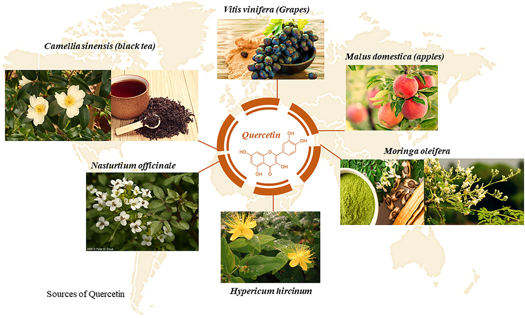 Plant sources of quercetin, a bioflavonoid with numerous medicinal properties.